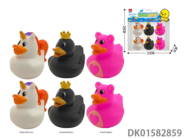 搪胶动物戏水玩具独角兽鸭,黄冠小黑鸭,粉色奶牛鸭3只盒装
