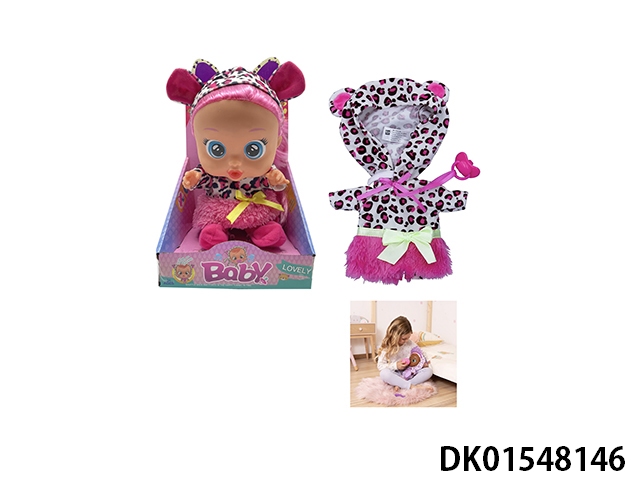 毛绒豹纹-第16代14寸搪胶哭泣带头发女孩版娃娃带四声音乐cry Babies-Tutti Fritti带流眼泪功能,带吸水奶瓶,带奶嘴 。毛绒带加暖功能。衣服2件套