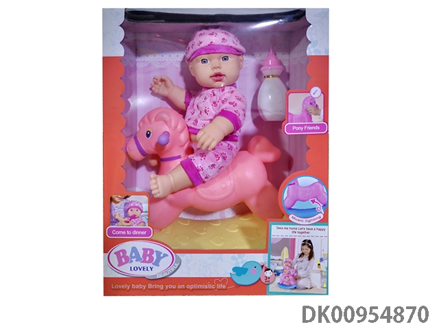 新款14寸搪胶娃喝水撒尿配灯光音乐摇马,奶瓶