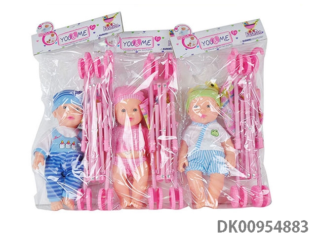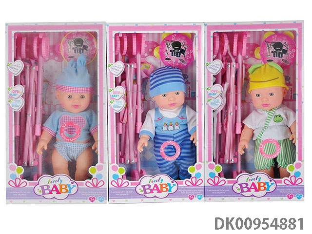 新款16寸喝水拉尿搪胶娃带推车,马桶,餐盘,尿裤,6声IC