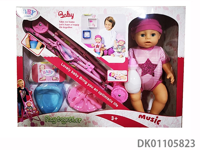 新款16寸喝水拉尿搪胶娃带推车,马桶,餐盘,尿裤,6声IC