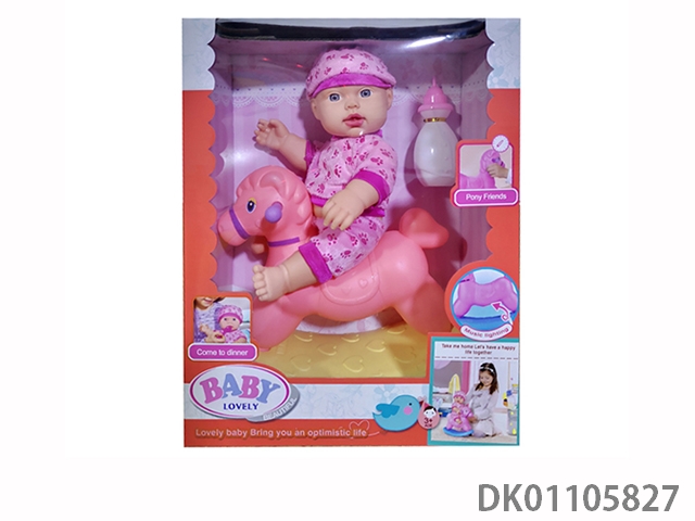 新款14寸搪胶娃喝水撒尿配灯光音乐摇马,奶瓶