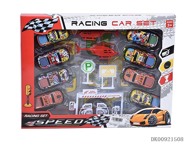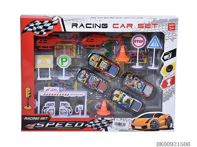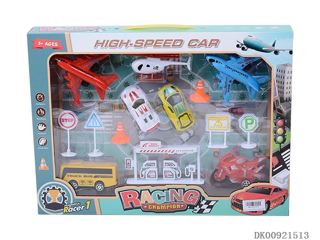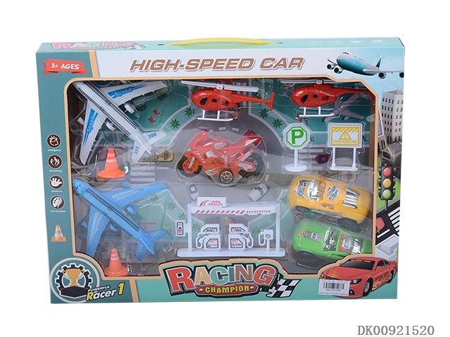 回力车飞机摩托车+直升机油站路标套装