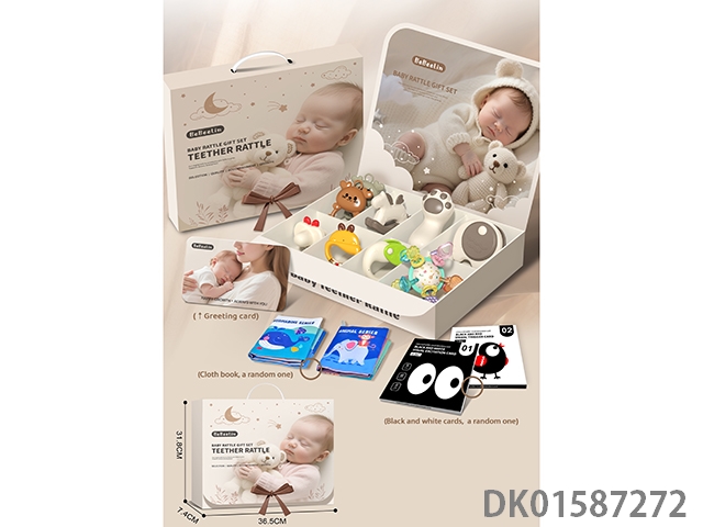 婴儿安抚摇铃玩具礼盒套装+曼哈顿球+水煮摇铃+布书+婴儿追视卡片(10PCS)送贺卡