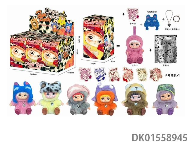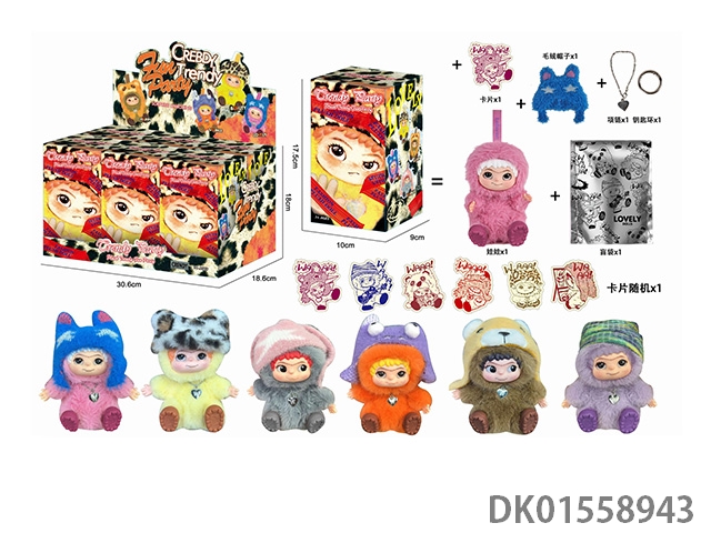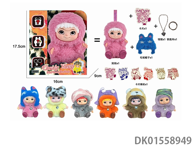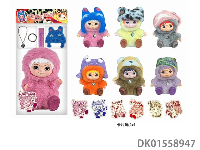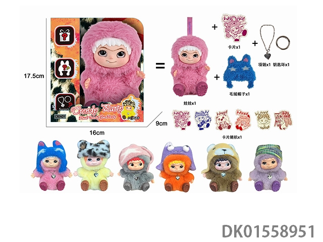 17厘米5D眼睛毛绒棉花搪胶面部 wakuku 娃娃单只带钥匙扣,项链,毛绒帽子6盲盒娃娃随机