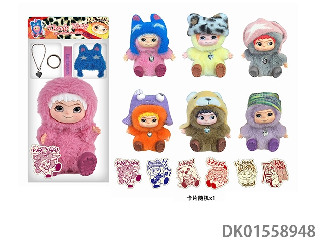 17厘米5关节5D眼睛毛绒衣服搪胶头塑料身 Wakuku 娃娃单只带钥匙扣,项链,毛绒帽子带七彩灯光主题曲6盲盒娃娃随机