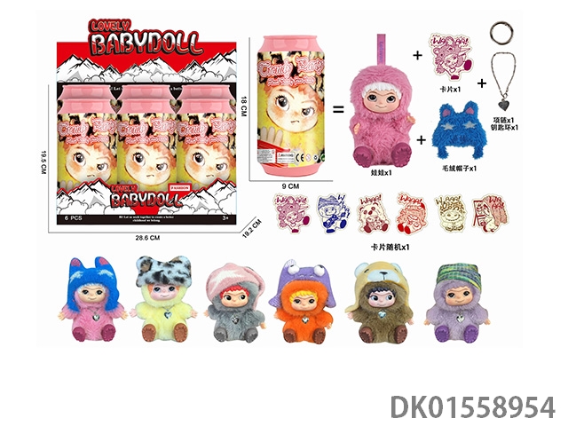 17厘米5关节5D眼睛毛绒衣服搪胶头塑料身 Wakuku 娃娃单只带钥匙扣,项链,毛绒帽子带七彩灯光主题曲6饮料罐娃娃随机