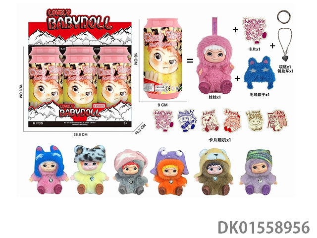 17厘米5D眼睛毛绒棉花搪胶面部 wakuku 娃娃单只带钥匙扣,项链,毛绒帽子6饮料罐娃娃随机
