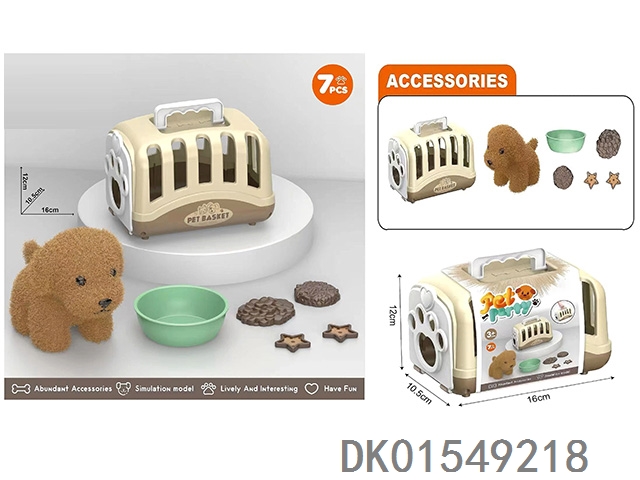 毛绒玩具宠物狗喂养套装+手提狗笼过家家儿童玩具