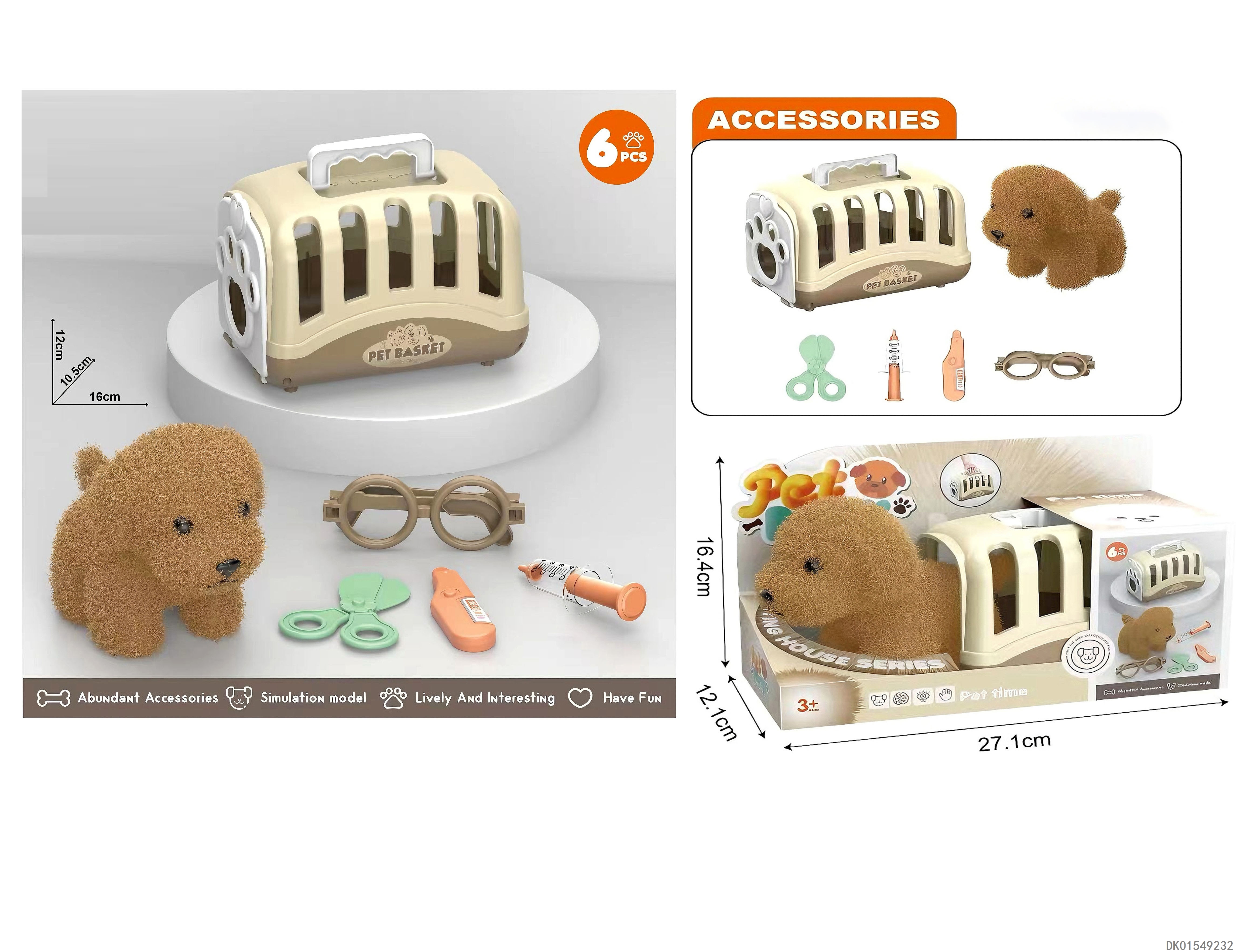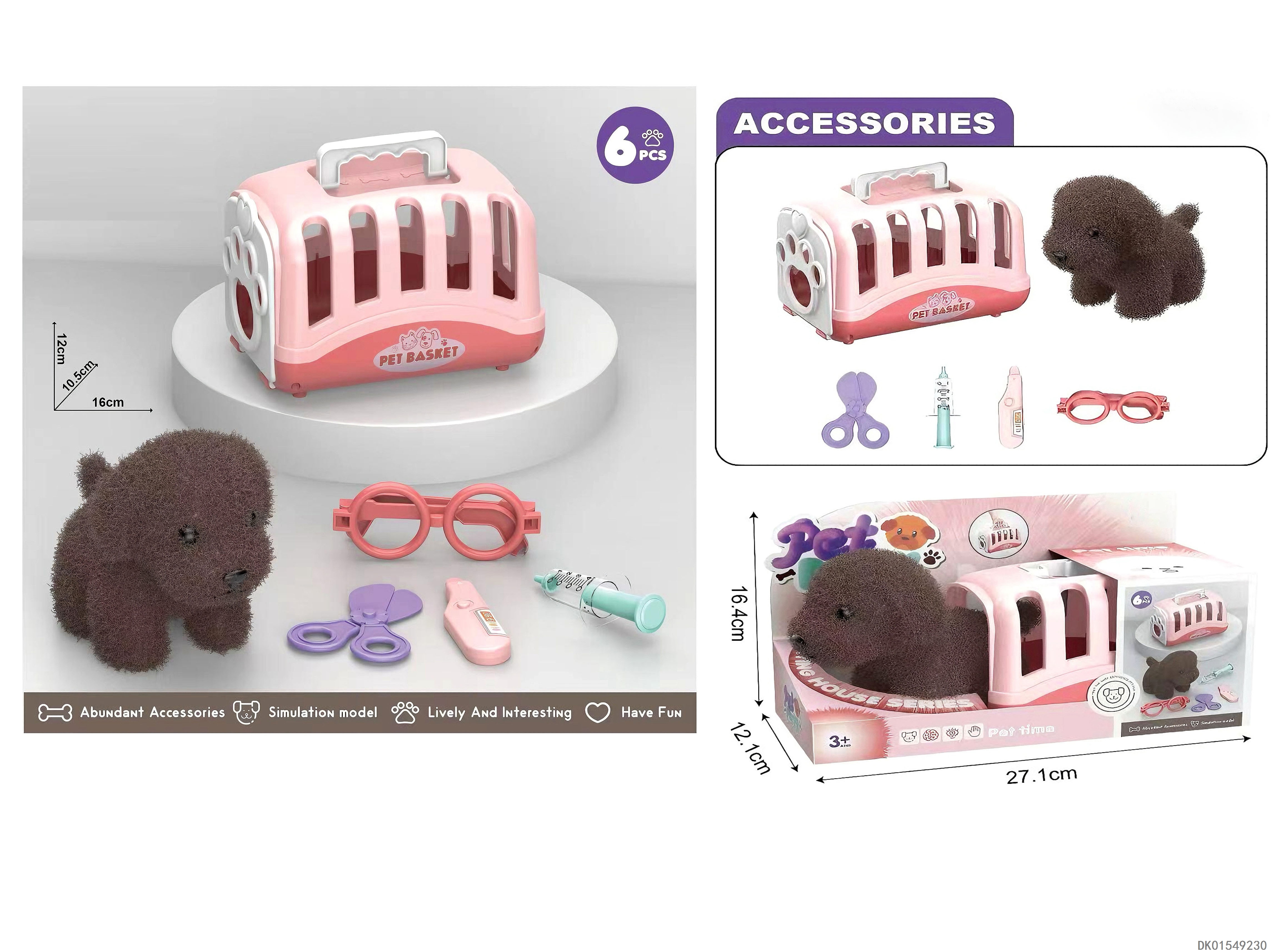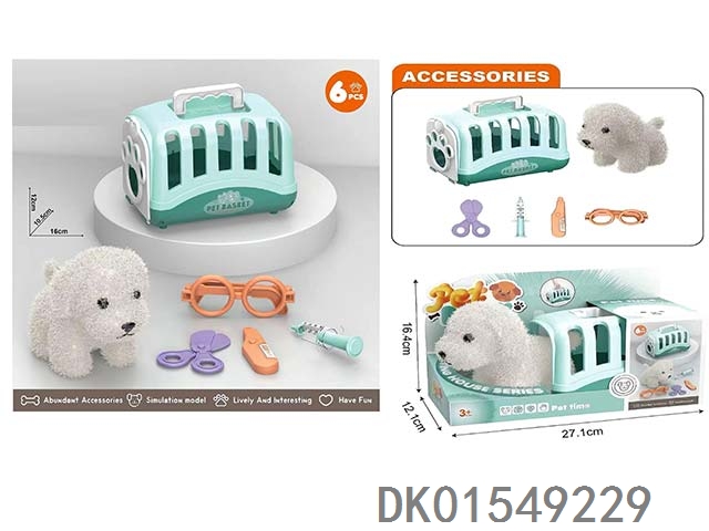 毛绒玩具宠物狗配医具套装+手提狗笼过家家儿童玩具