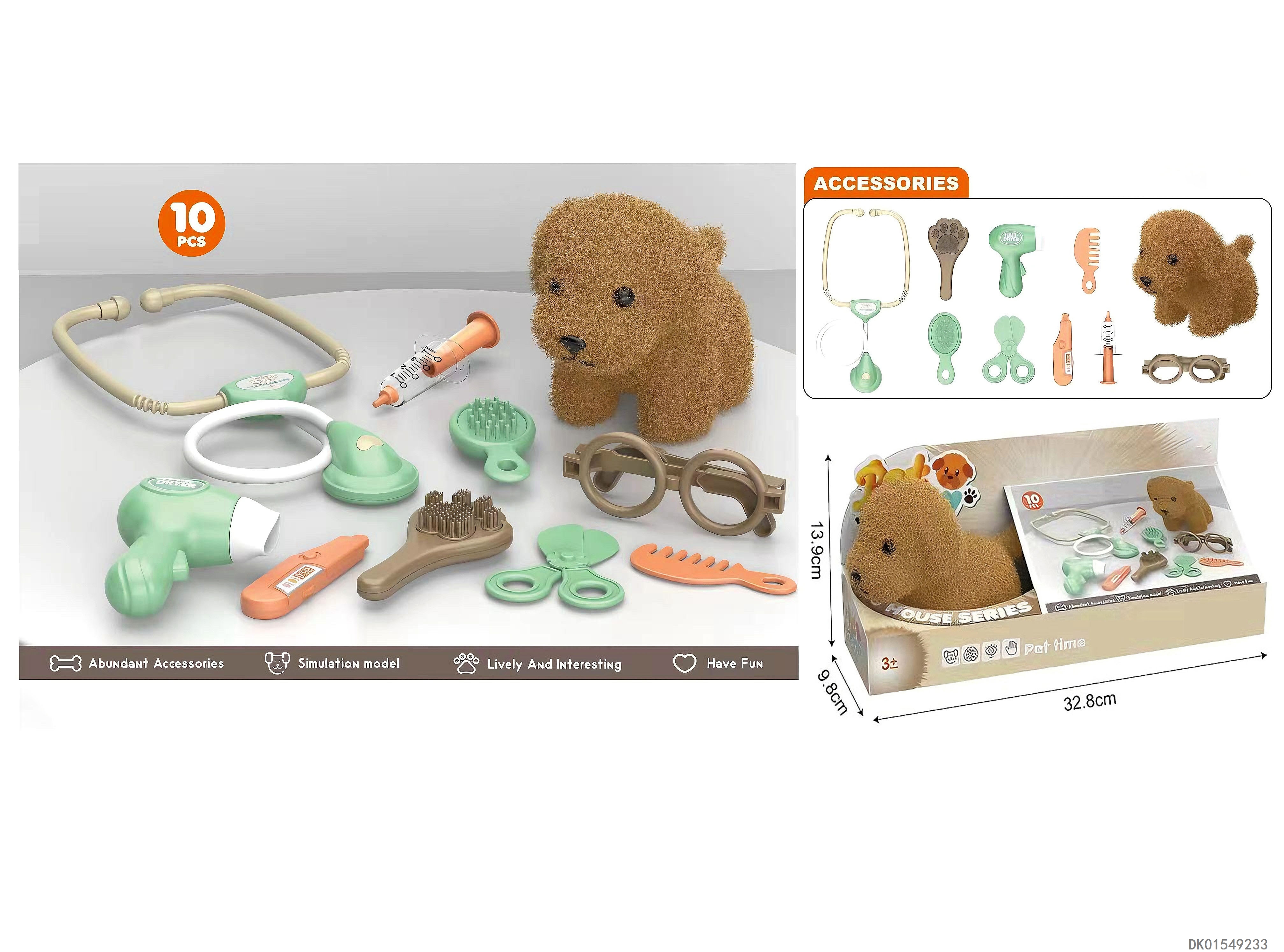 毛绒玩具宠物狗配医具套装+理发套装(2合1)过家家儿童玩具