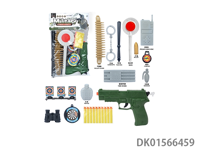 军事套(子弹链条+手铐+警棍+停车牌+金子弹+对讲机+指南针+定时炸弹+手雷+连体枪靶+水壶+望远镜+枪靶+子弹夹+五四软弹枪)