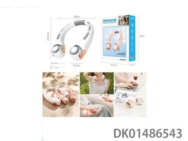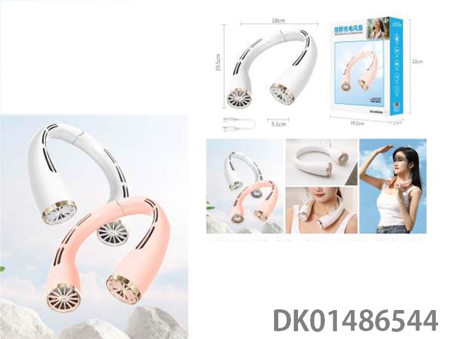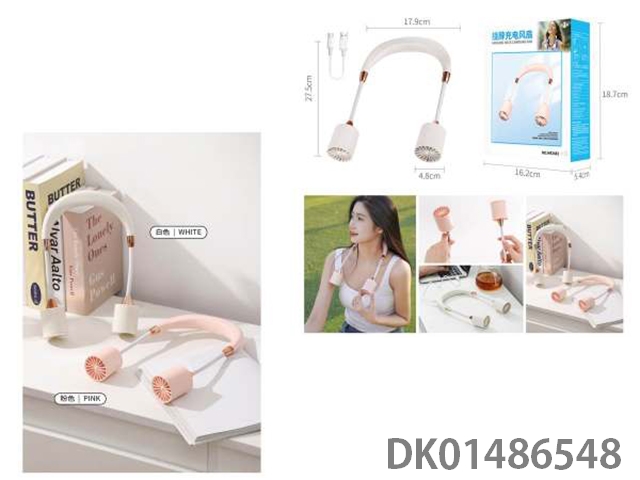 Pink/white neck hanging charging fan