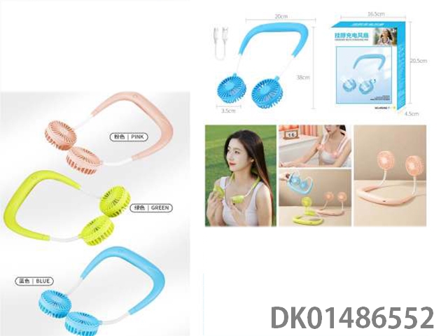 Pink/blue/green neck hanging charging fan