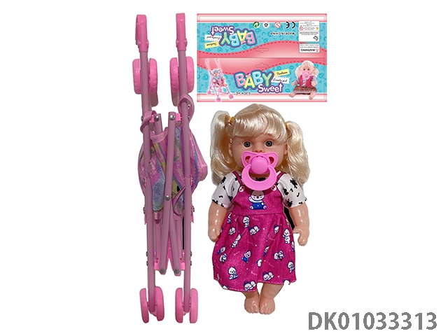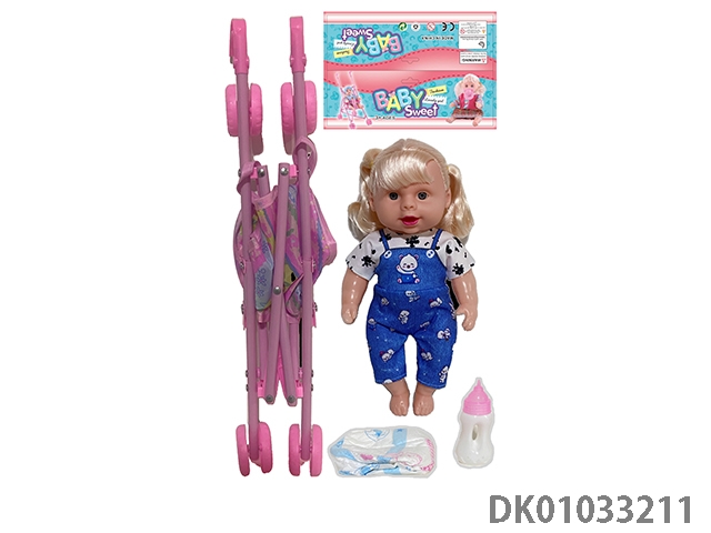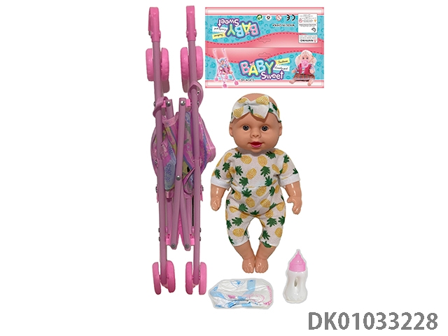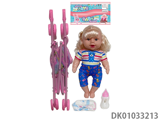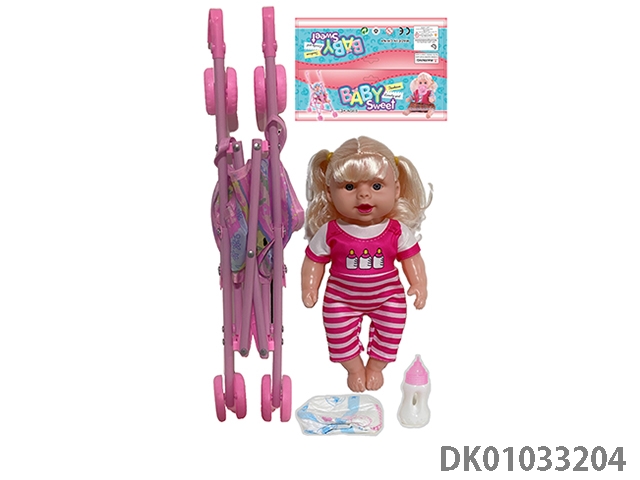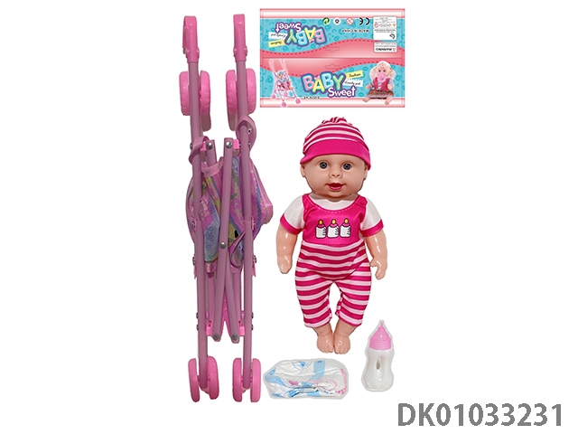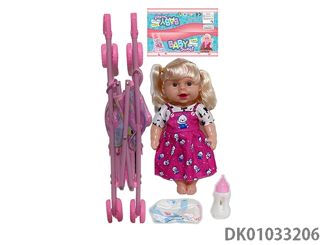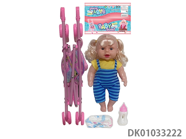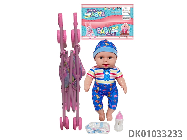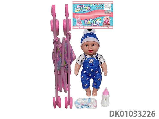Bagged 12 “empty body, bent feet (eye piece), drinking water, urinating, male baby with cart, bottle and diaper