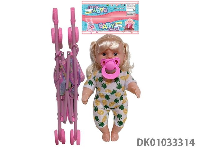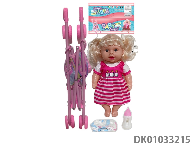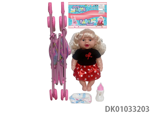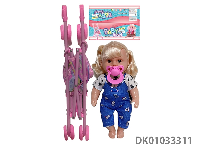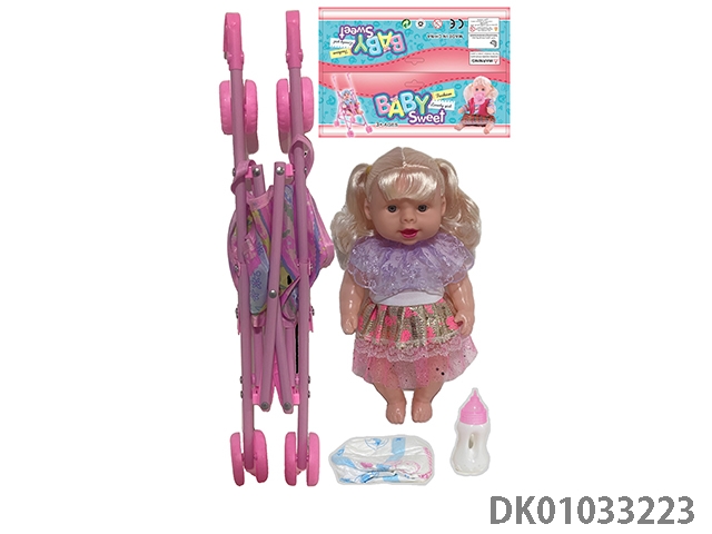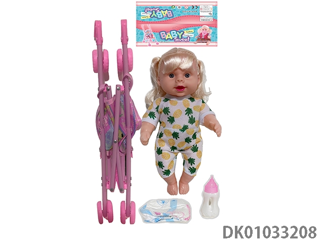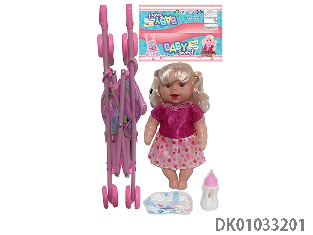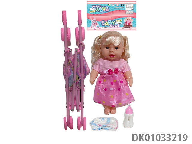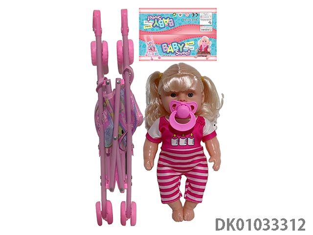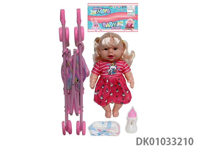 Bagged 12 “empty body, bent feet (eye piece), drinking water, urinating, male baby with cart, bottle and diaper