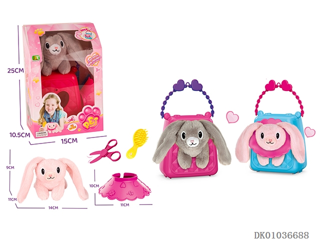 Plush long eared rabbit handbag in extremely colorful box