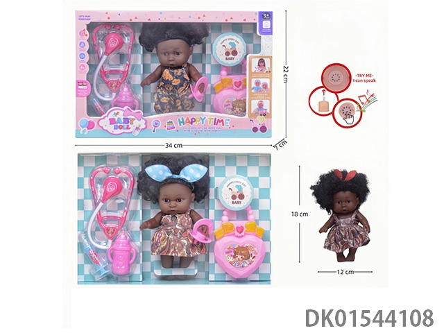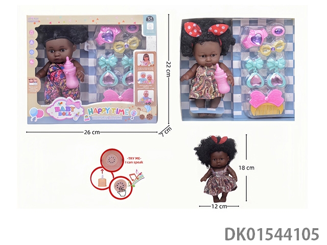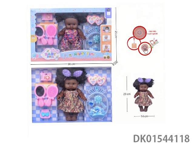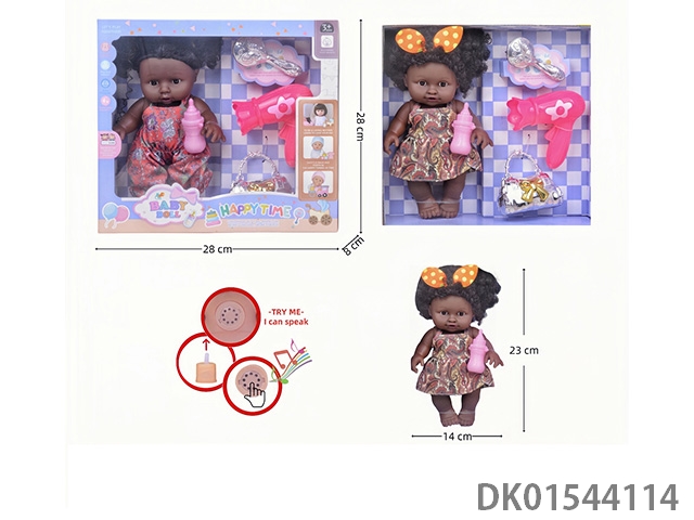 10 Inch full vinyl black expression doll with milk bottle, hair dryer, comb bag, two mixed designs (with 4-speaker ic)