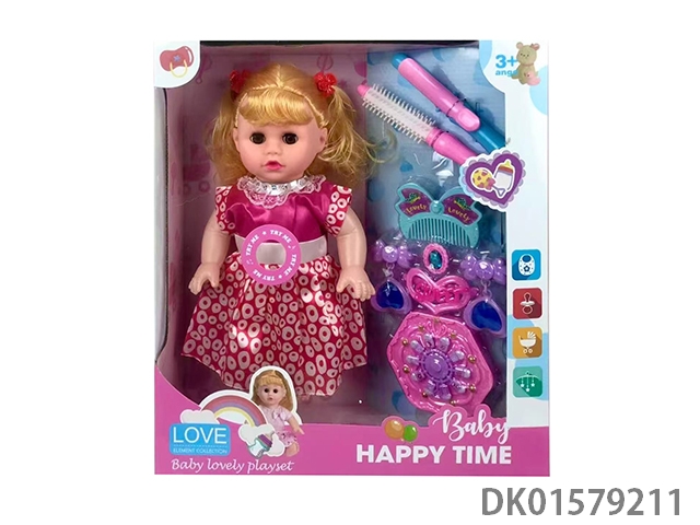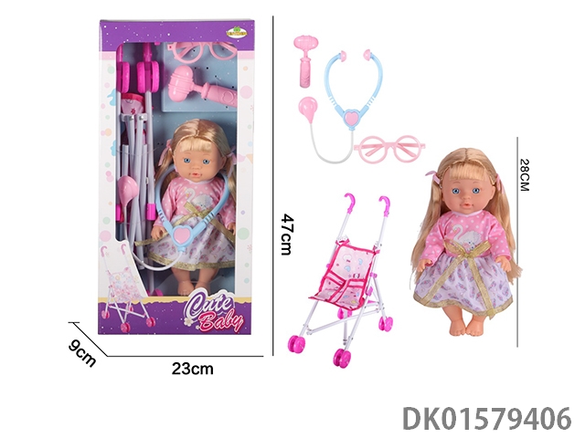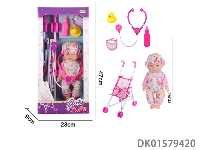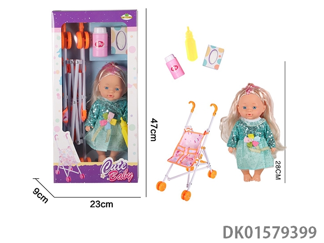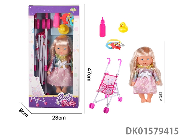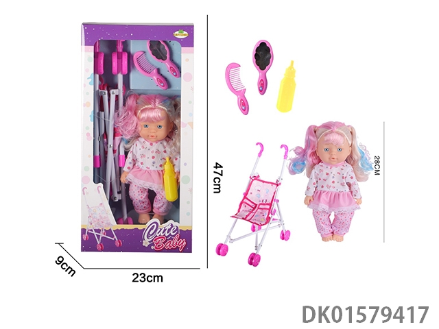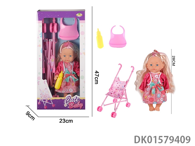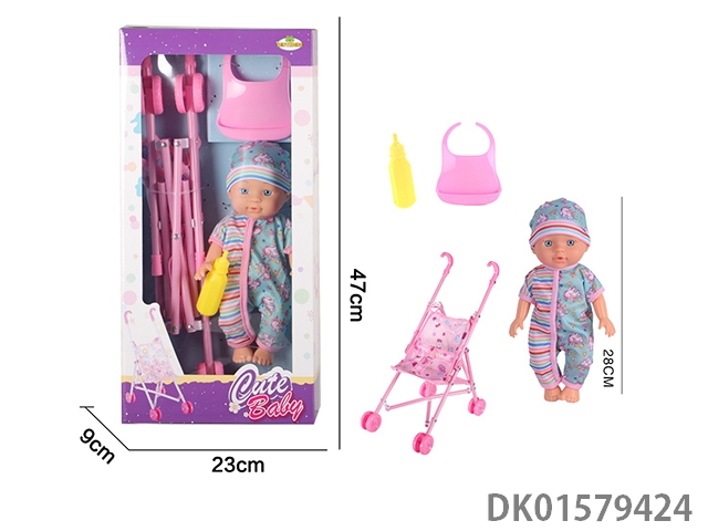 12 Inch blow bottle fixed eye drinking water female doll with absorbent bottle, comb, mirror, 45cm plastic cart, without ic