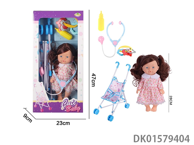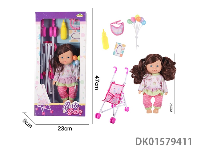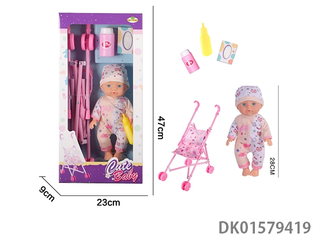 12 Inch blow bottle fixed eye drinking water female doll with absorbent bottle, loop, earpiece, 45cm plastic cart, without ic