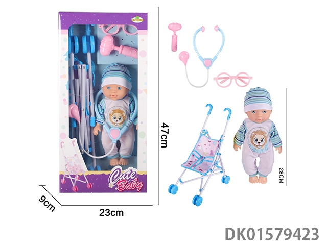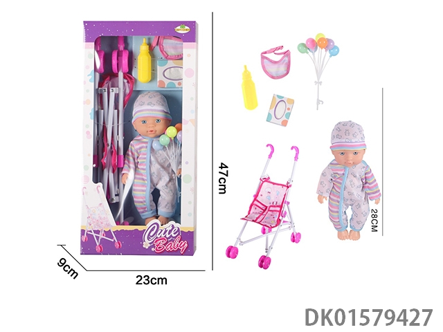 12 Inch blow bottle fixed eye drinking water male doll with drinking bottle, scarf, balloon, tissue box, 45cm plastic cart, without ic