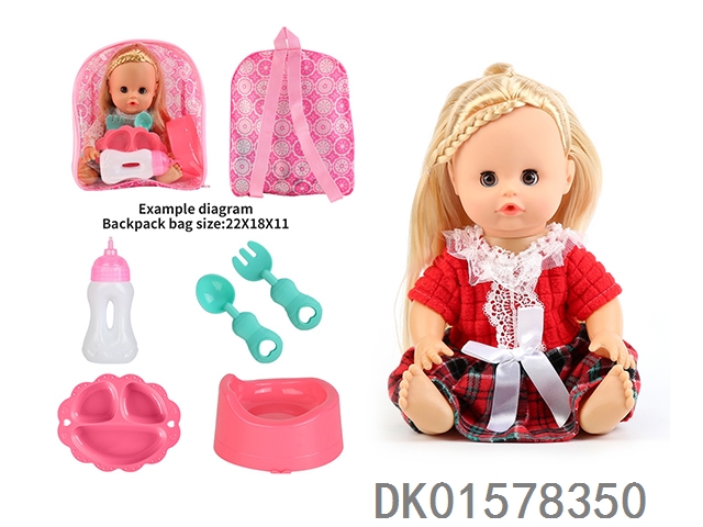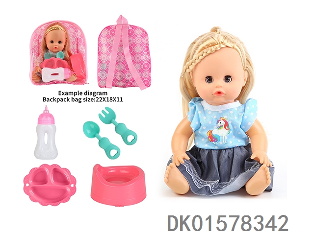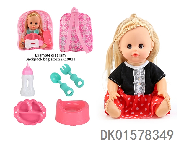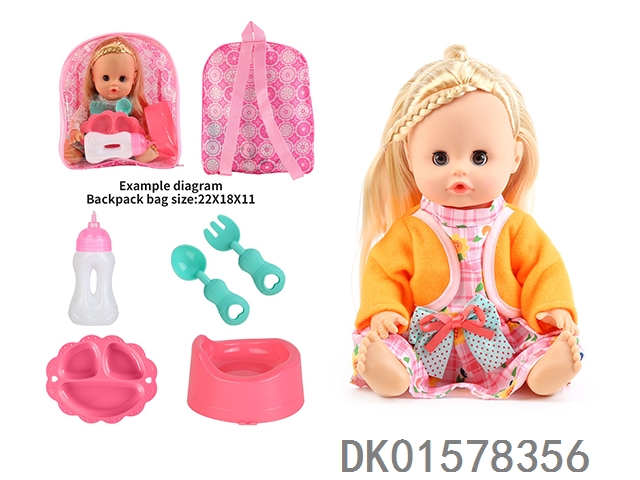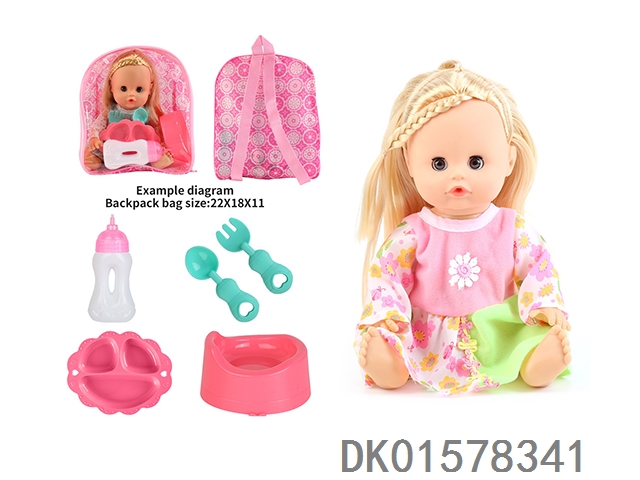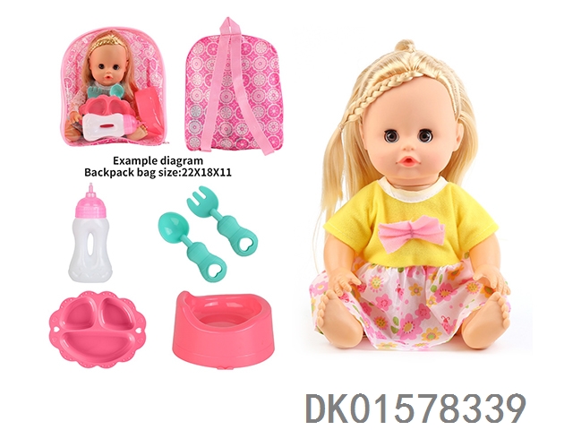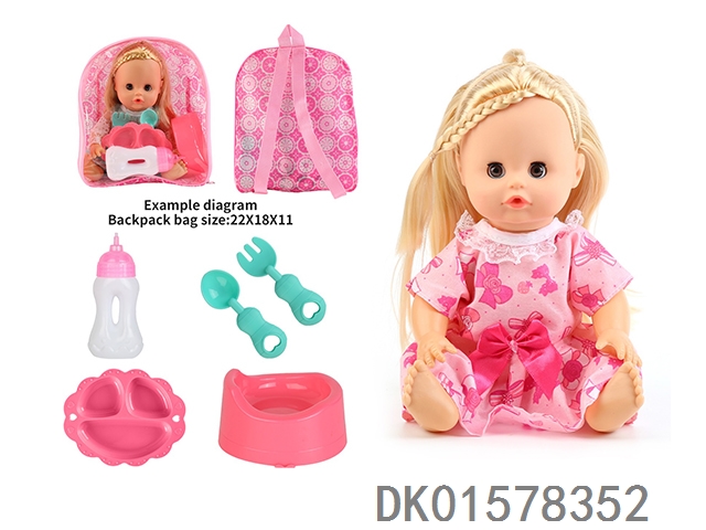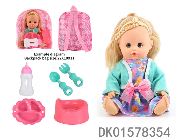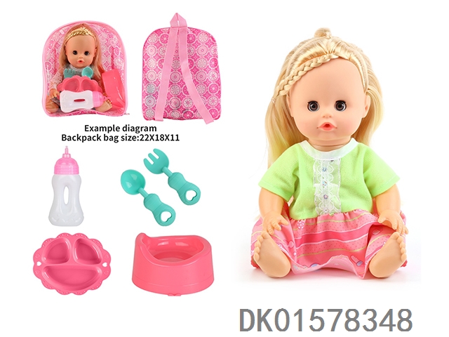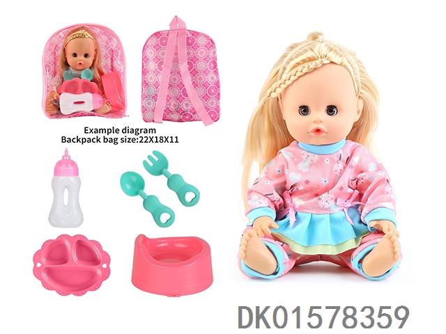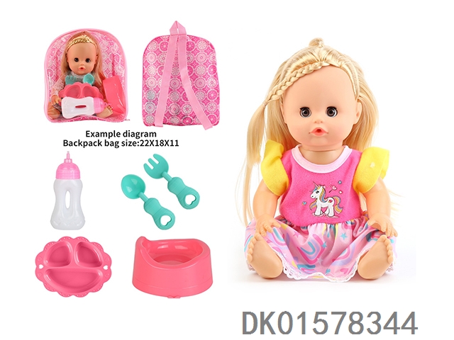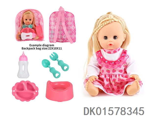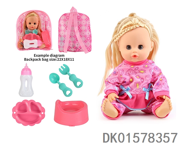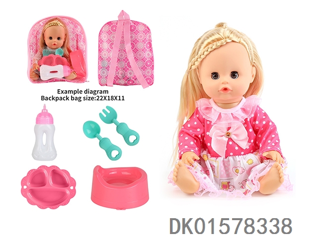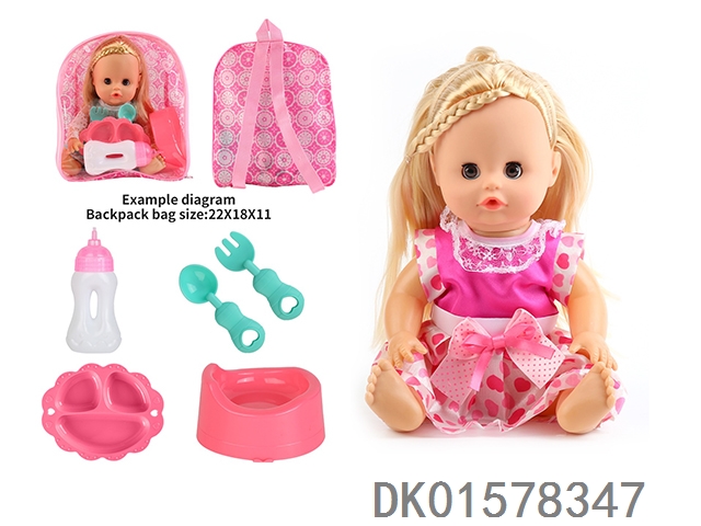 14 Inch doll with active eyes, 30cm, bent feet, drinking water, urinating with 4 sounds, ic bottle, plate, fork spoon, toilet
