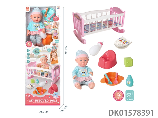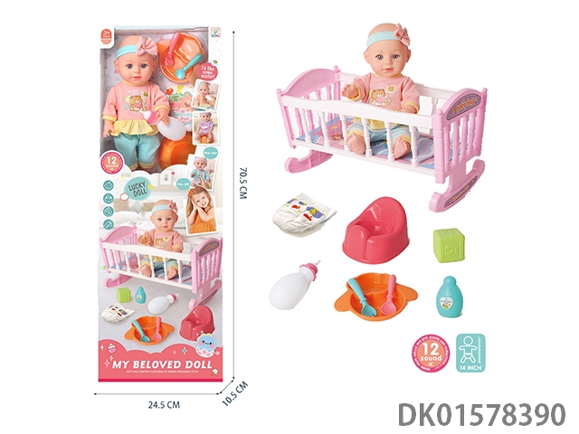 14 Inch vinyl doll with 12 sound music and baby crib care set (including 3 ag13 batteries)