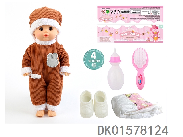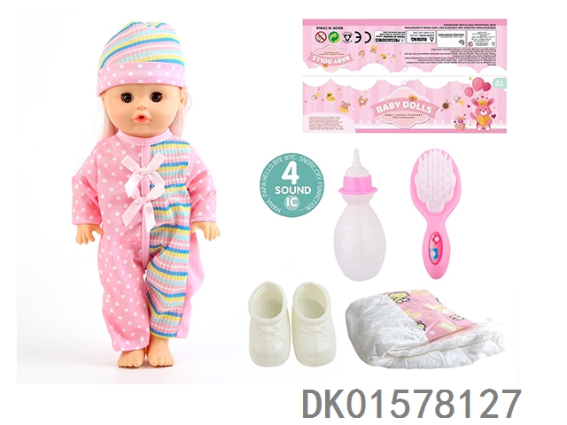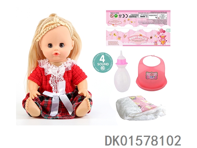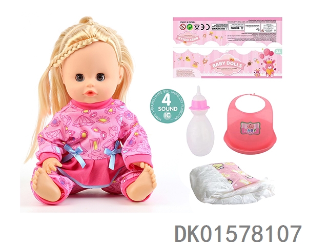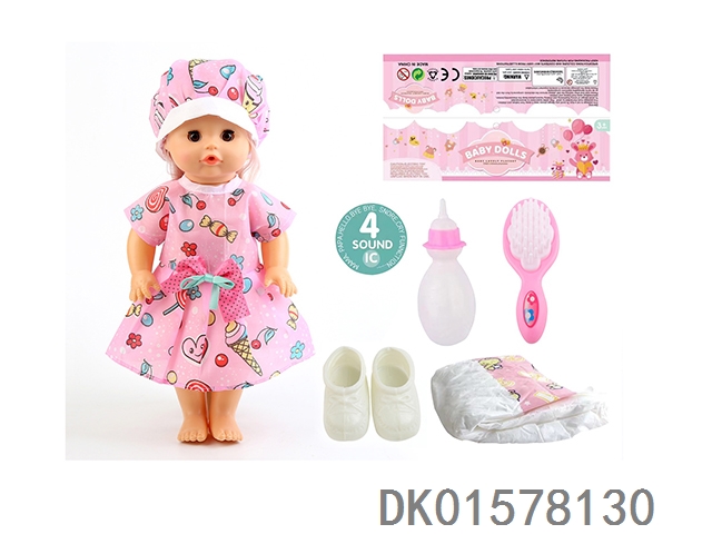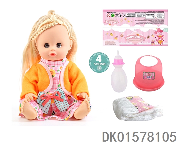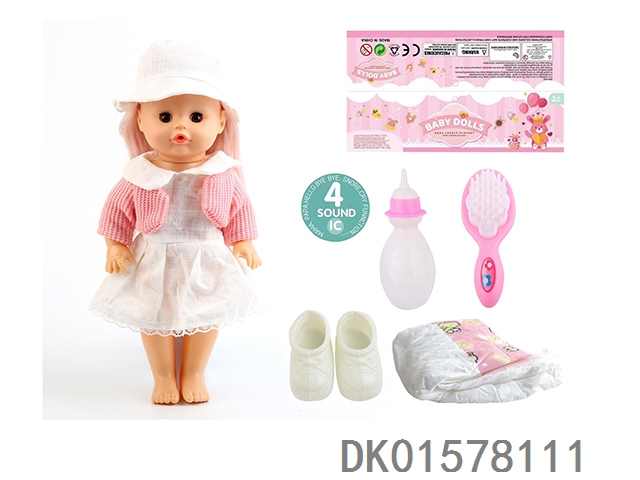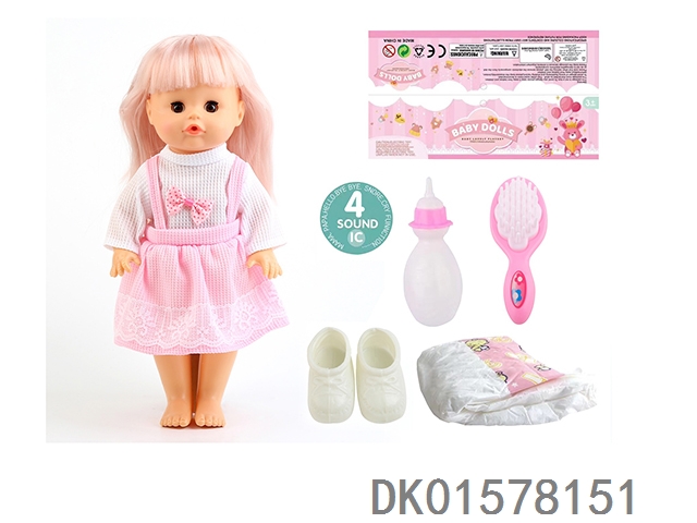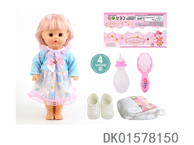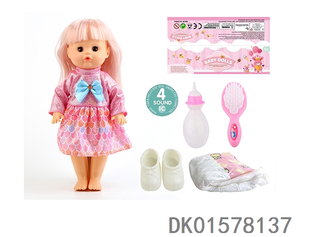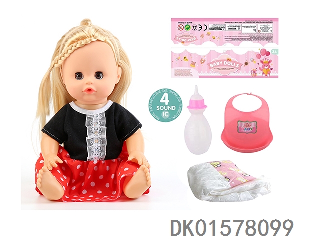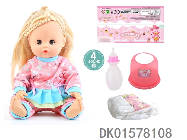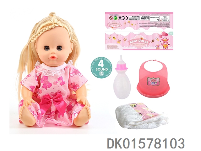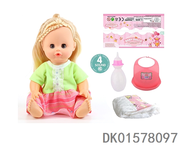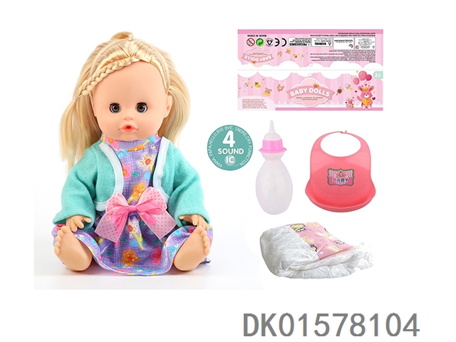 14 Inch doll with active eyes, 30cm, bent feet, drinking water, urinating with 4 sounds, ic bottle, bib, diaper