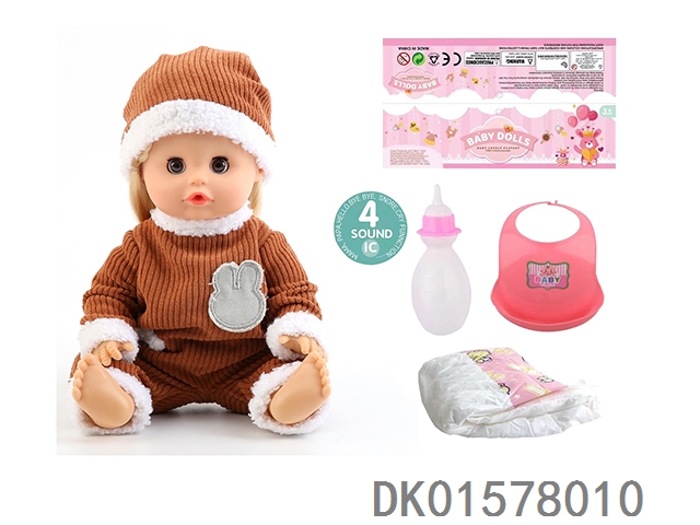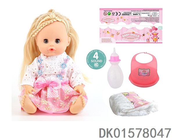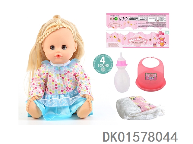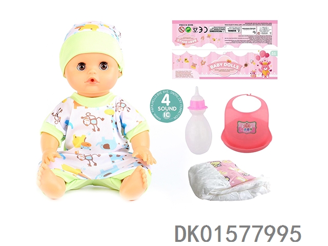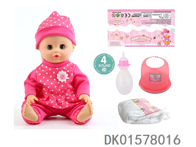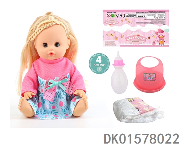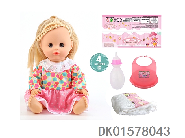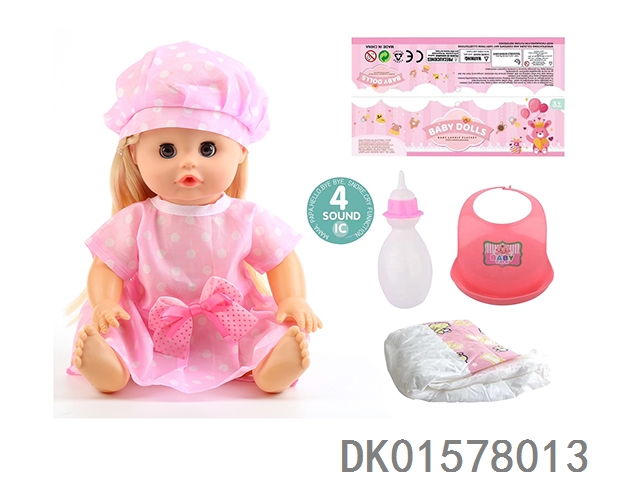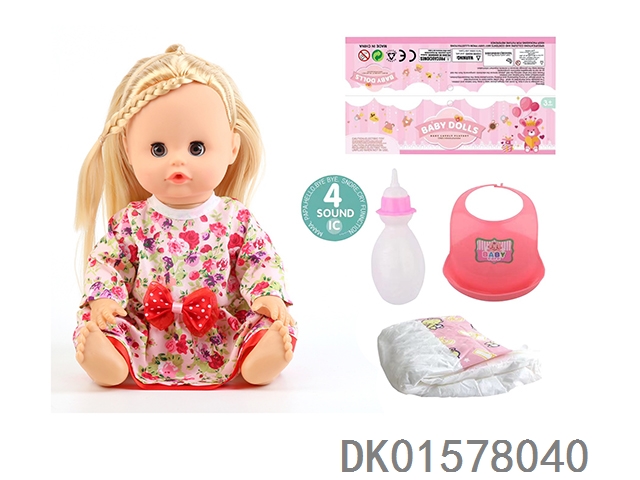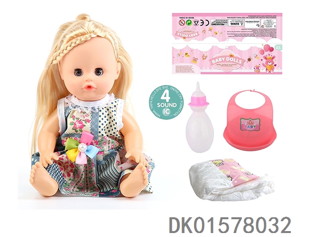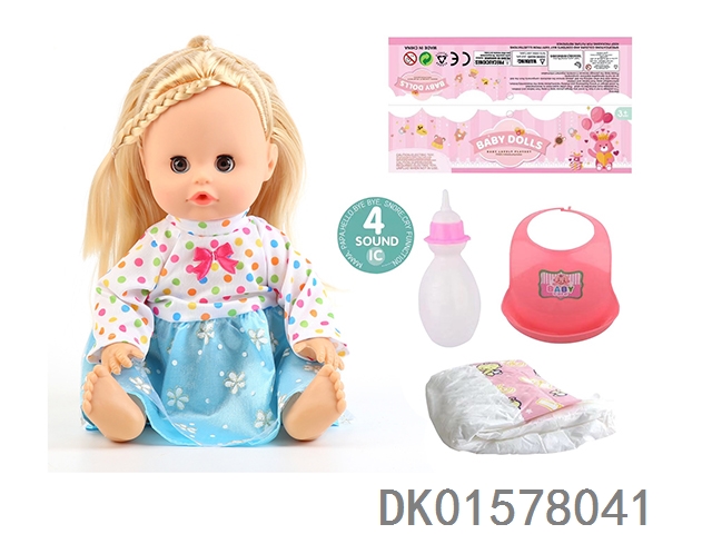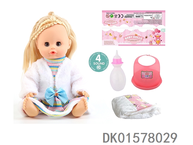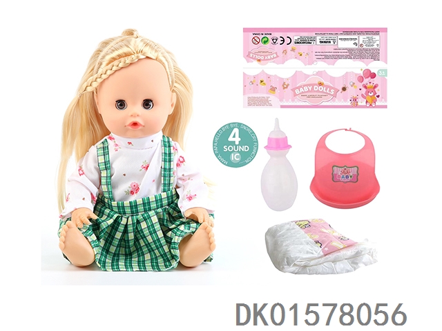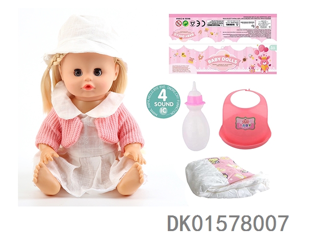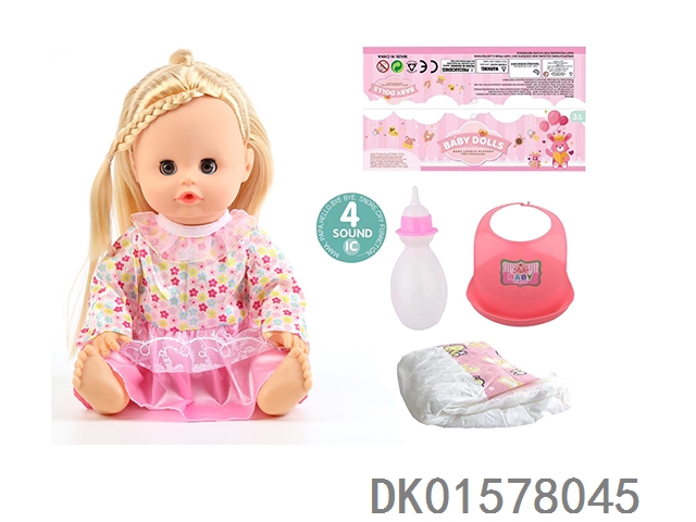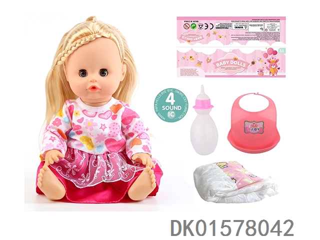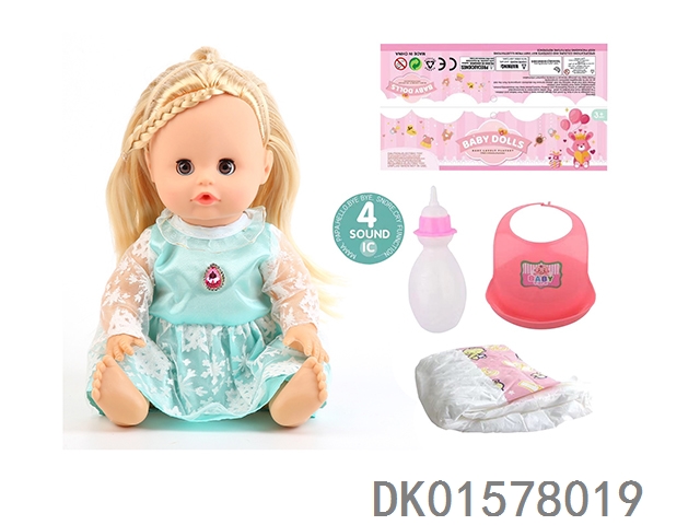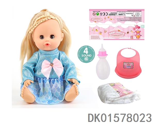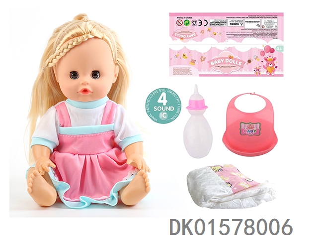 14 Inch doll with active eyes, 30cm, bent feet, drinking water, urinating with 4 sounds, ic bottle, bib, diaper