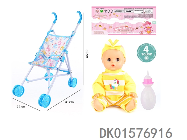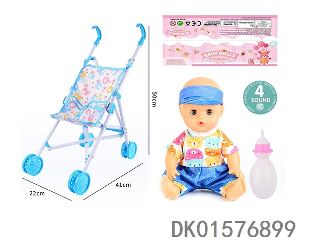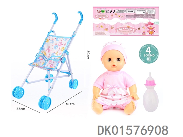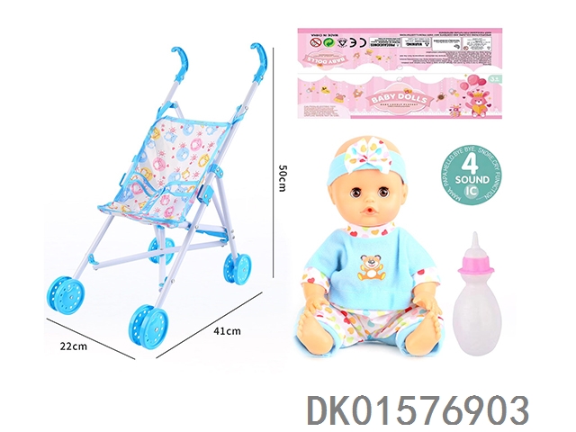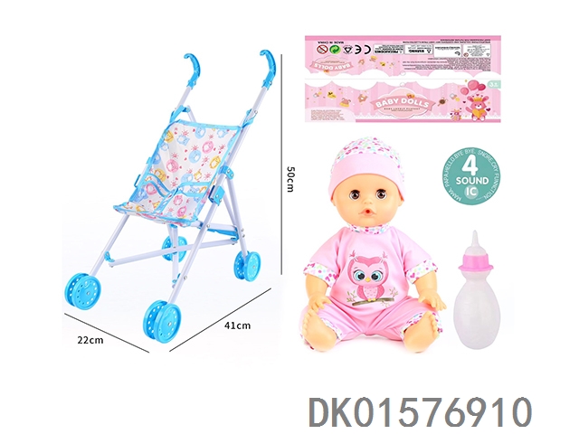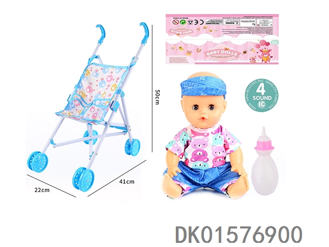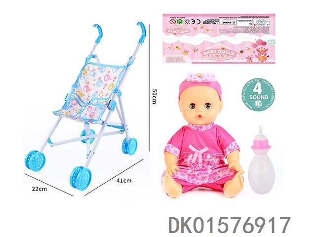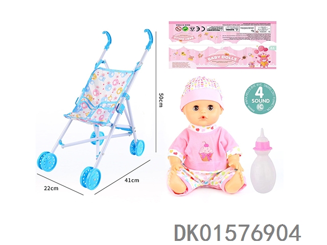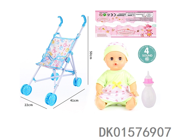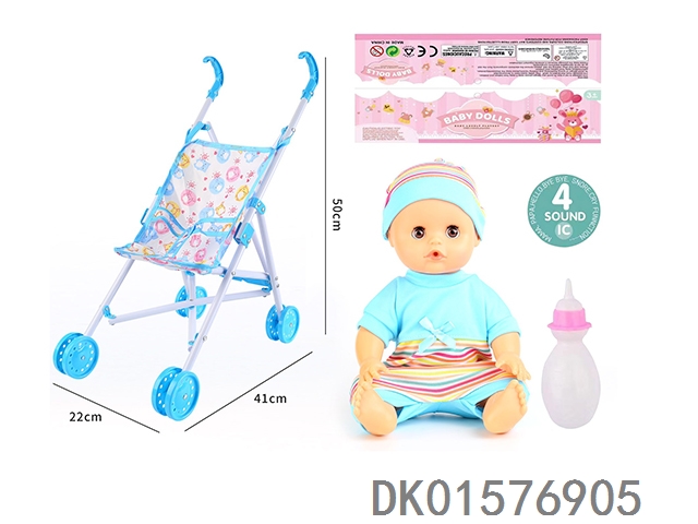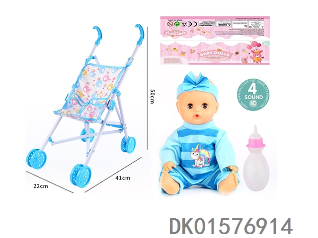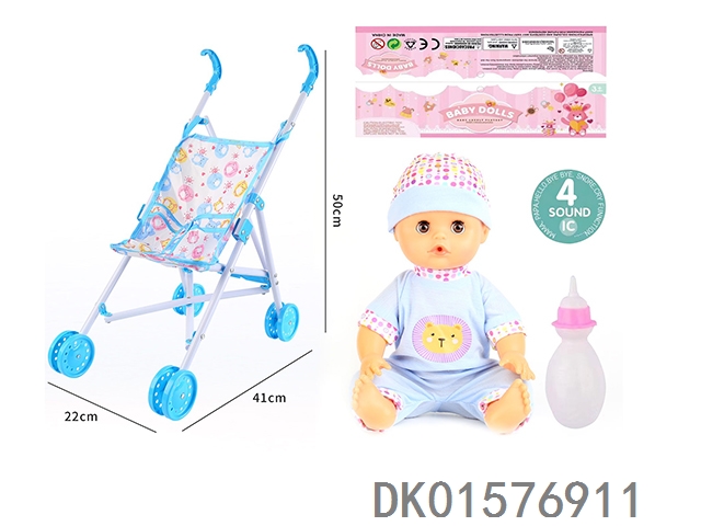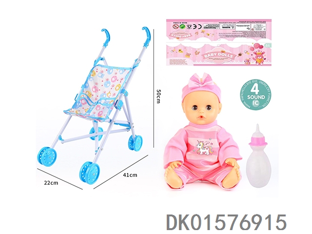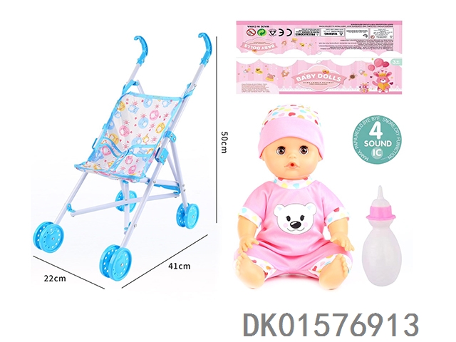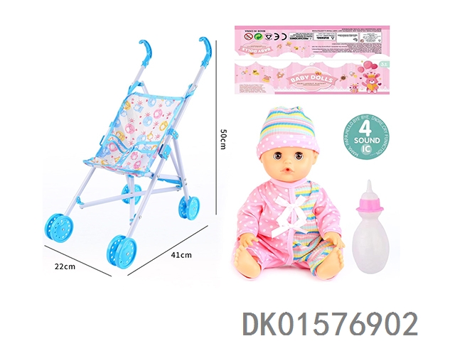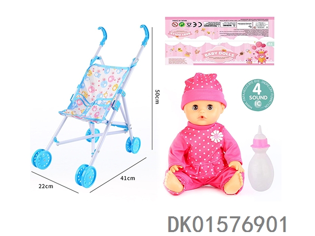 Cart and 14 inch doll with 30cm bent legs, active eyes, drinking water, urinating with 4 sound ic bottle