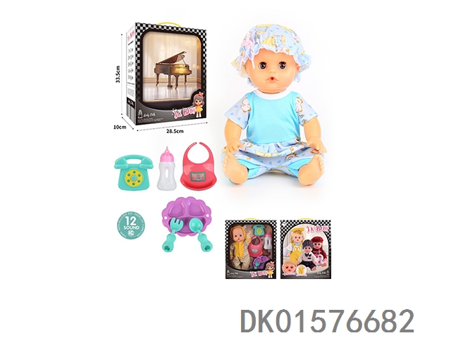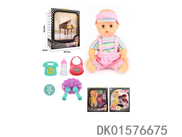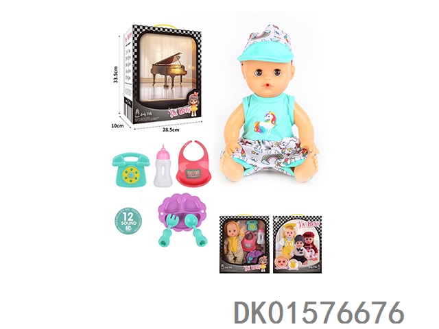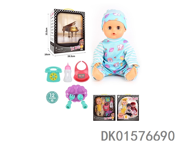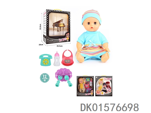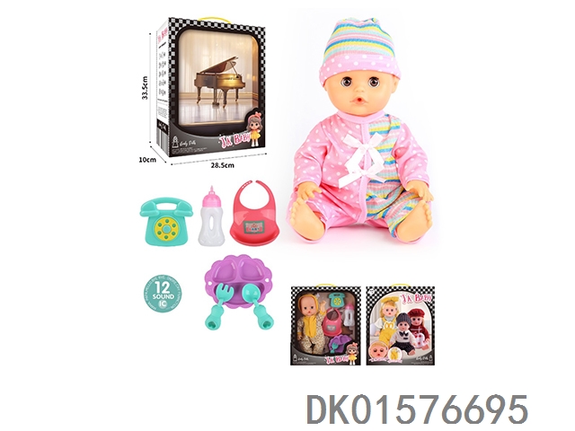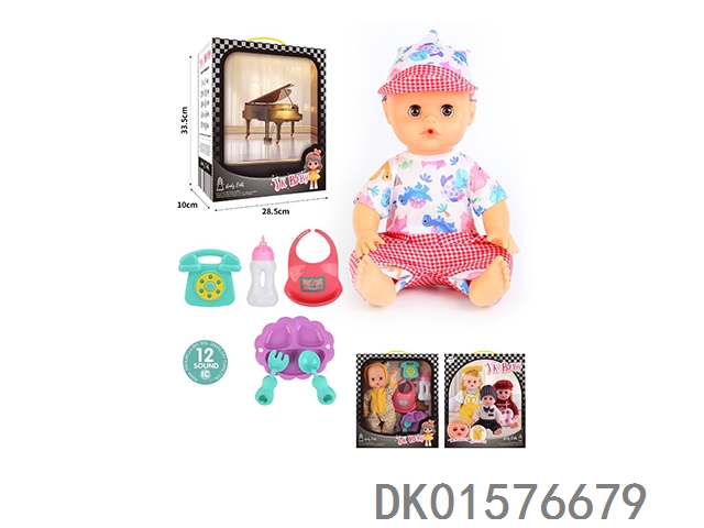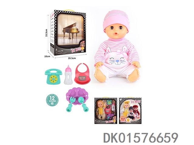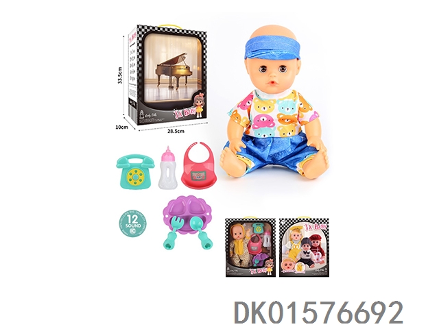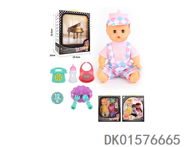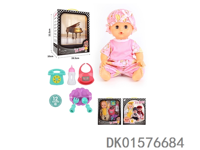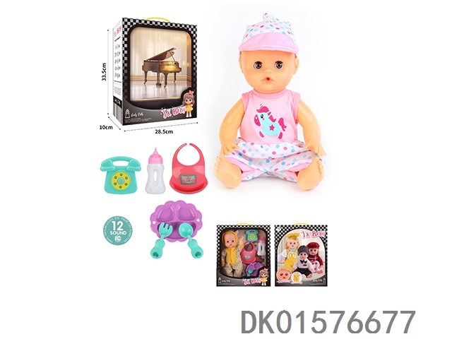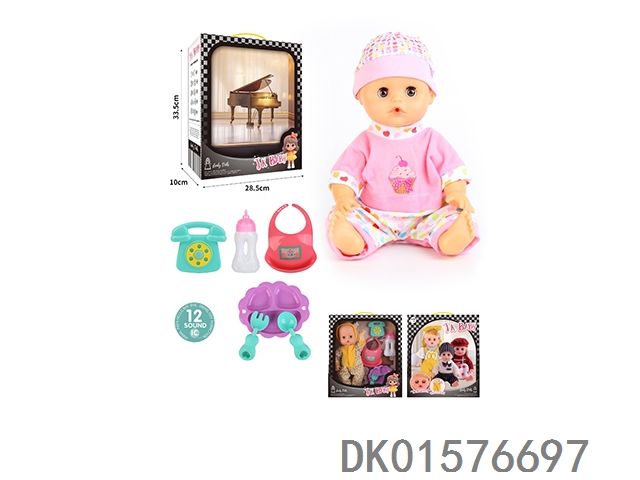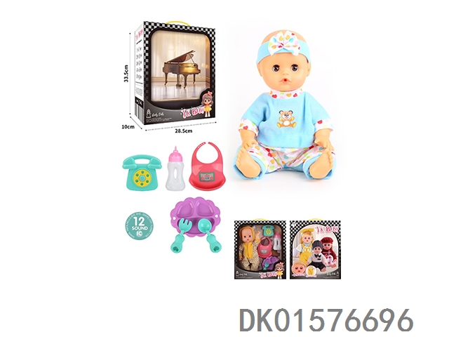 14 Inch doll with active eyes, 30cm, bent feet for drinking water and urinating with 12 sound ic phone, bottle, bib, plate, fork, spoon