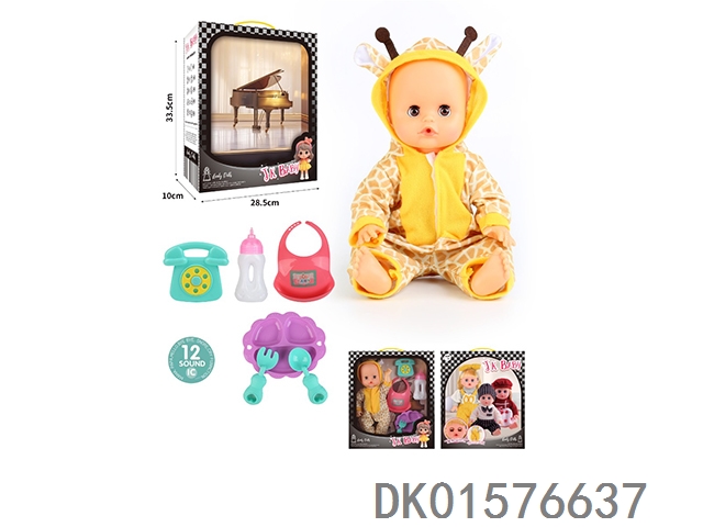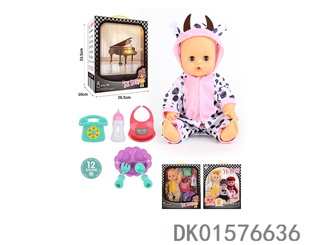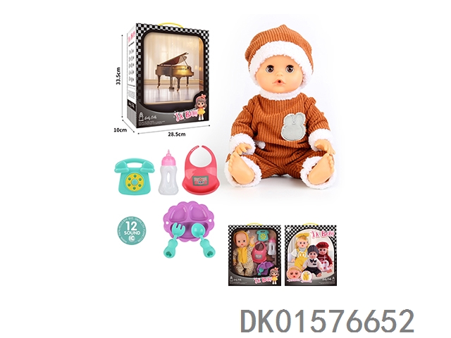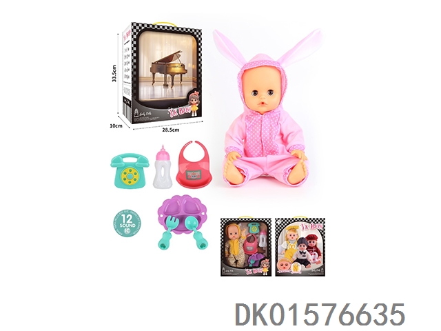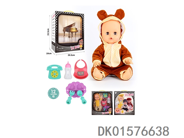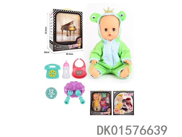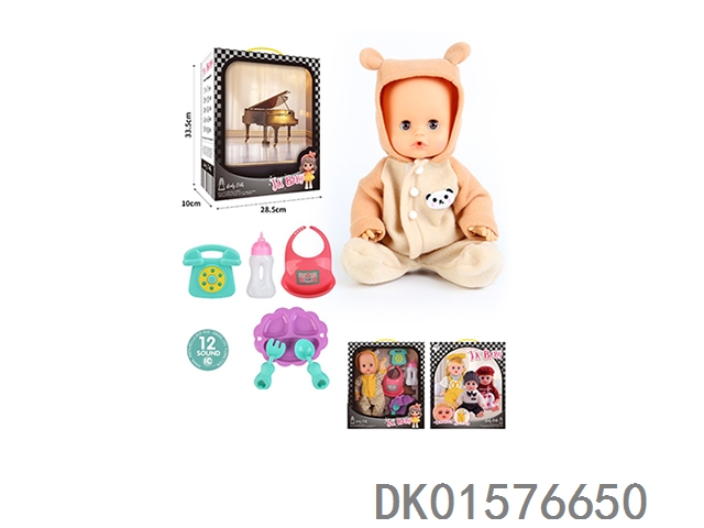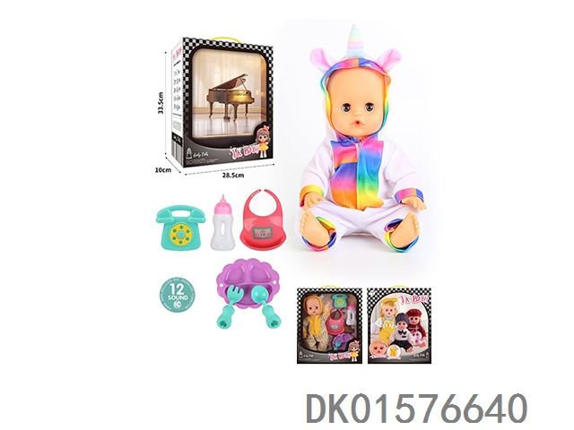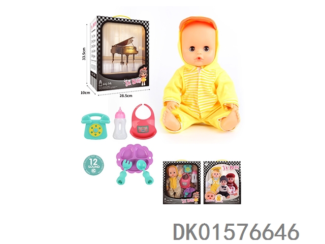 14 Inch doll with active eyes, 30cm, bent feet for drinking water and urinating with 12 sound ic phone, bottle, bib, plate, fork, spoon