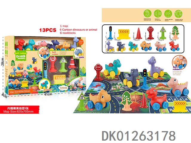Set of 6 enamel animal dinosaur cars (equipped with 4 random road signs), 9pcs/box