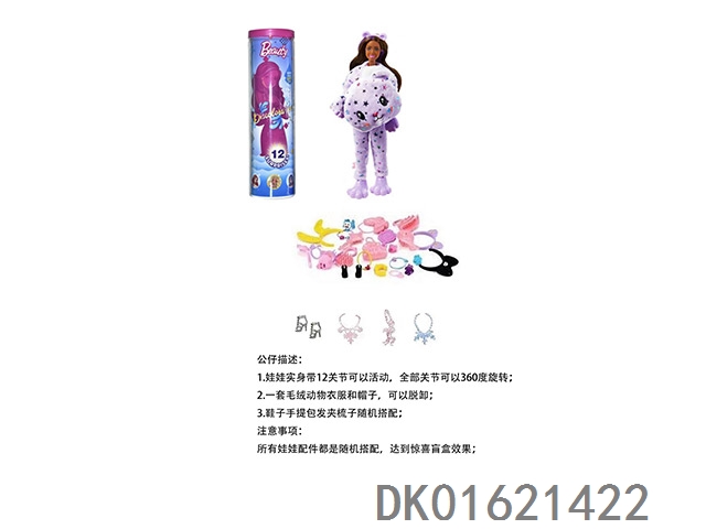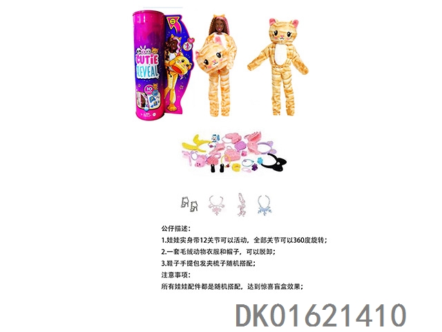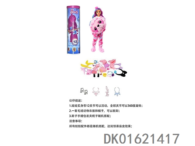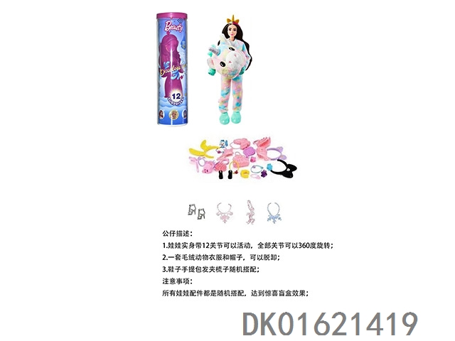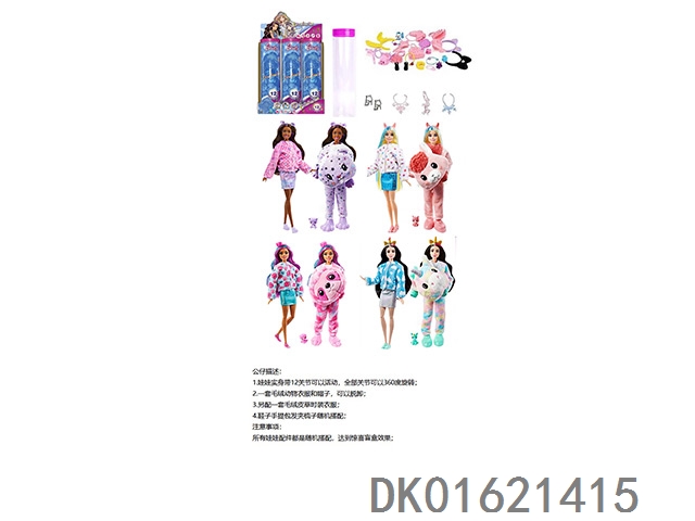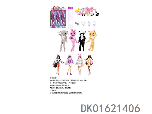 High end surprise 11.5-inch 12 joint real-life cute pet barbie with 1 set of animal plush fashion clothes. bring hair clips, handbags, and shoes. 4 accessories for the necklace. there are 2 sets of clothes, 4 styles, 6pc mixed, 6pcs/box