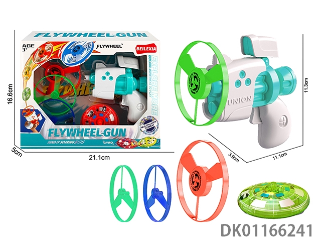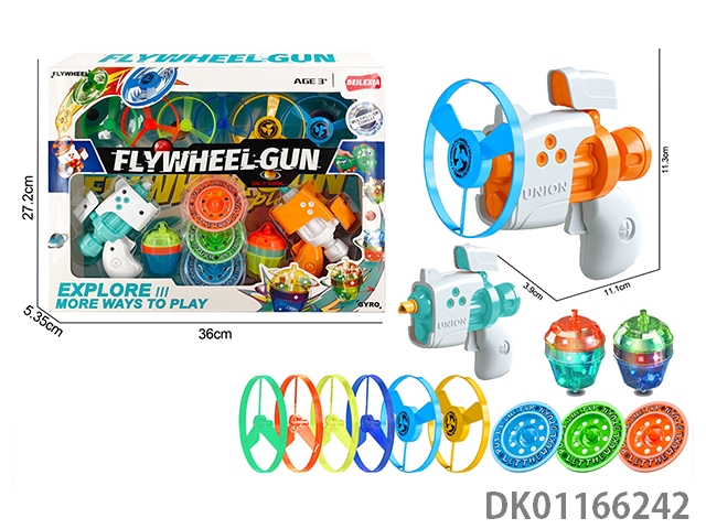 1 Gun, 7 color flash gyroscopes, 4 flying saucer guns
