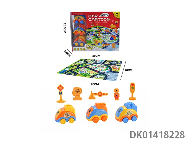 3 Solid colored q-version cartoon engineering inertia cars, carpet roadsign set