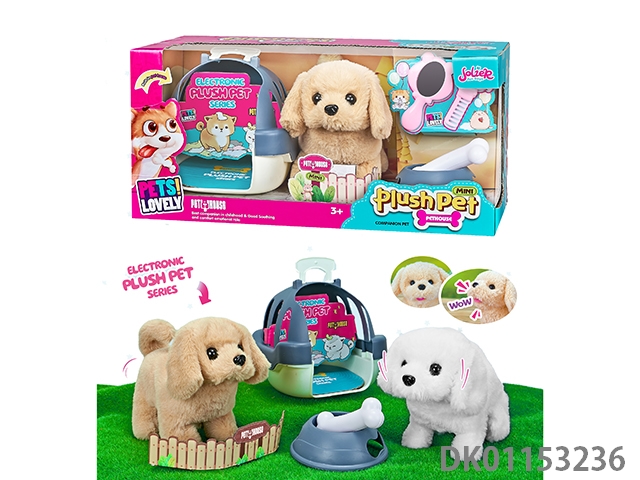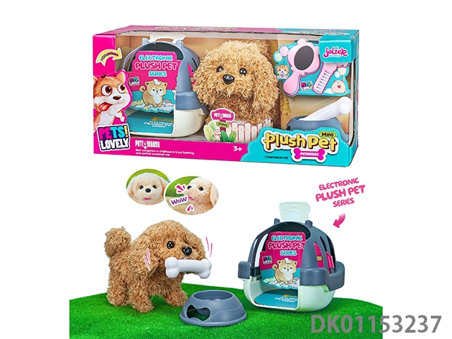 Electric plush medium size beard dog/golden dog and dog blue with a food basin and bones, as well as a mirror and comb