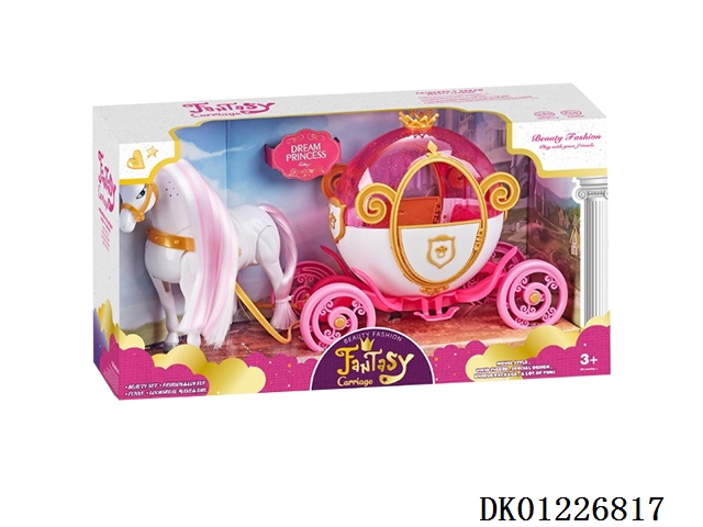 Electric pony and pumpkin car, and 15.5cm full bodied doll horseshoe (3 no. 5 batteries, not included)