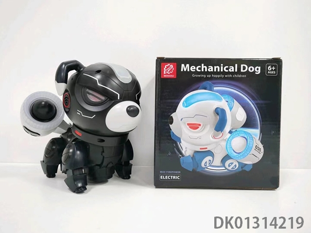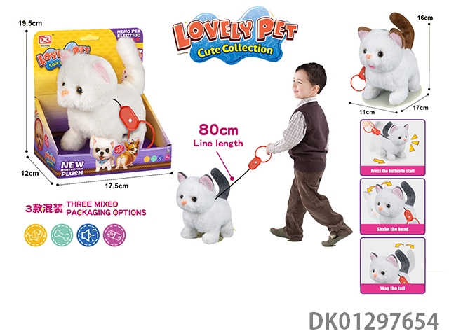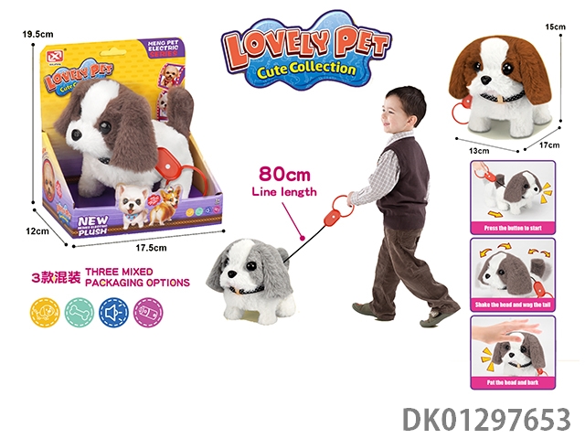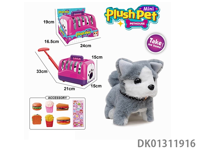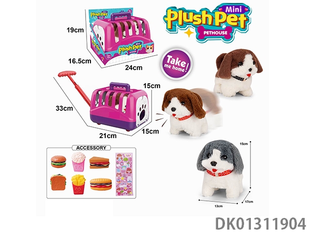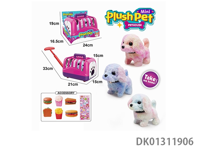 Electric colored plush walking dog and hand pulled animal cage and burger combo