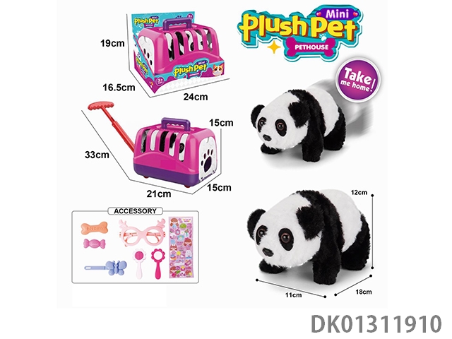 Electric plush walking panda and hand pulled animal cage and accessory set