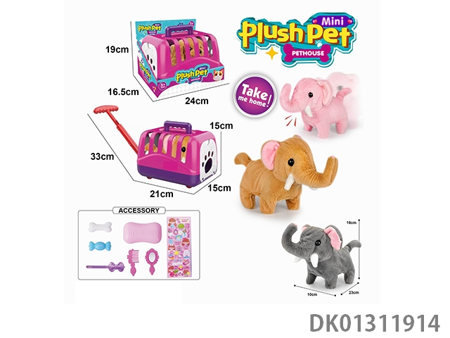 Electric plush walking elephant and hand pulled animal cage and accessory set