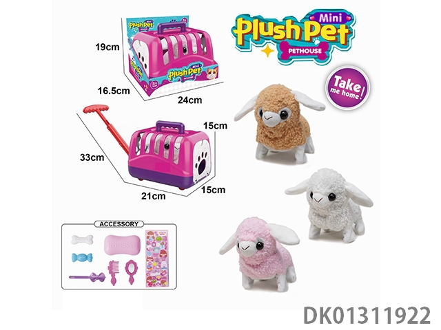 Electric plush walking lamb and hand pulled animal cage and accessory set