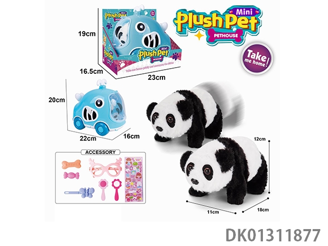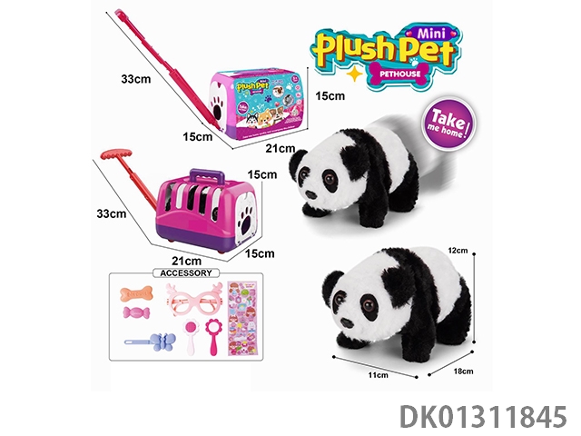 Electric plush walking panda and hand pulled animal cage and accessory set
