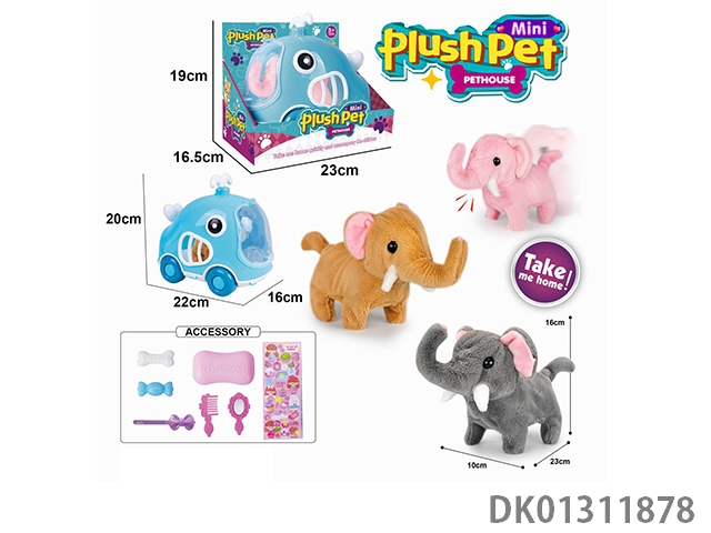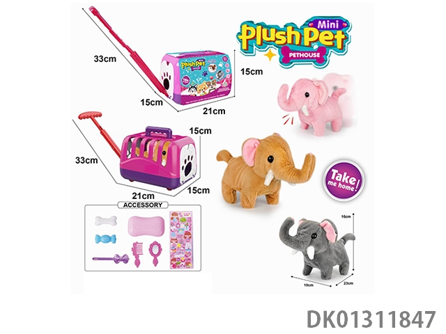 Electric plush walking elephant and hand pulled animal cage and accessory set