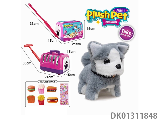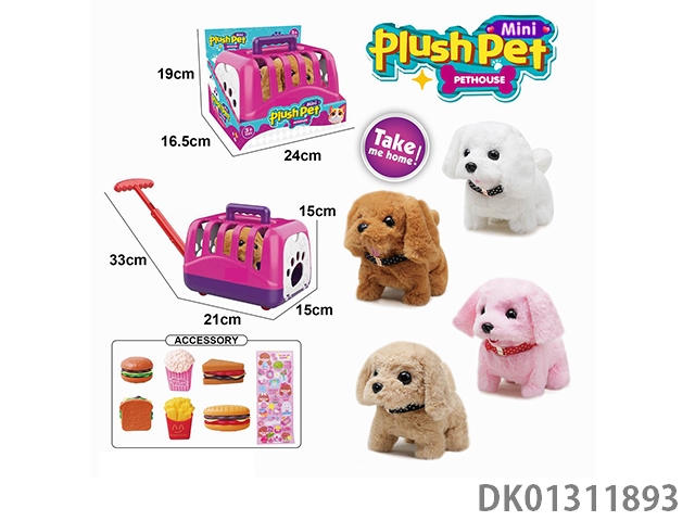 Electric plush walking dog and hand pulled animal cage and burger combo