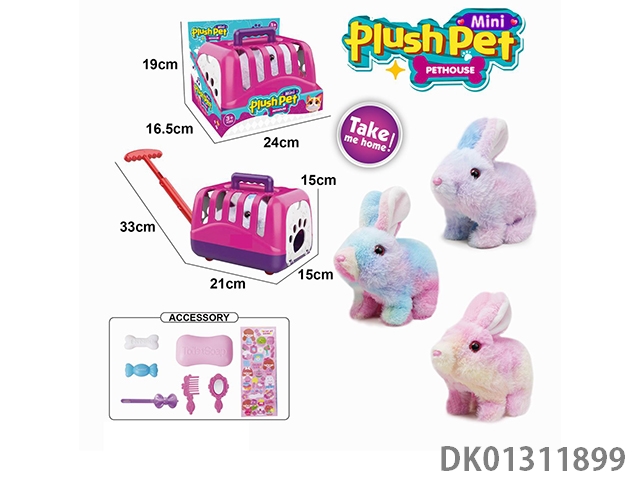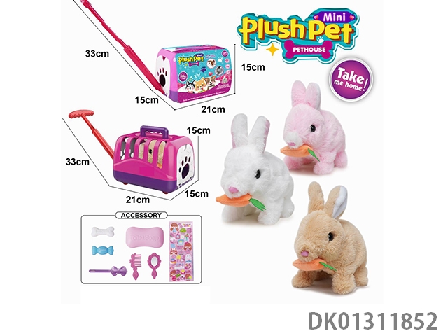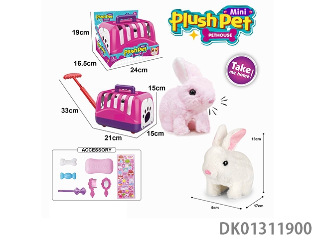 Electric plush colored walking rabbit and hand pulled animal cage and accessory set