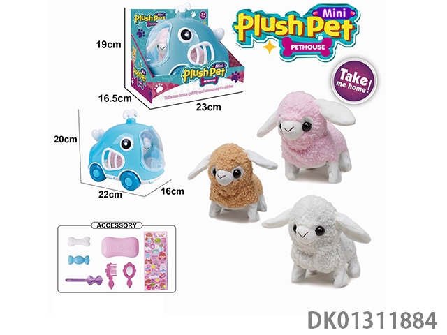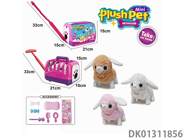 Electric plush walking lamb and hand pulled animal cage and accessory set