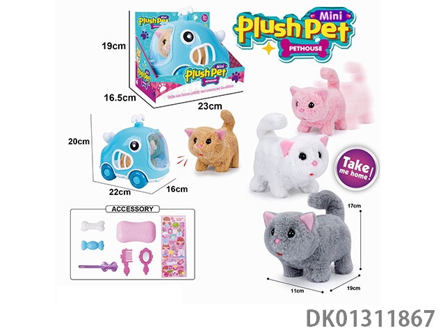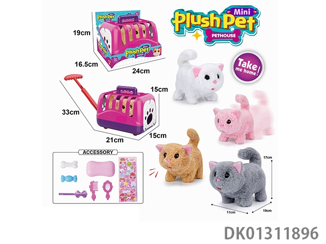 Electric plush walking cat and hand pulled animal cage and accessory set