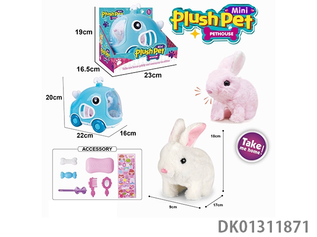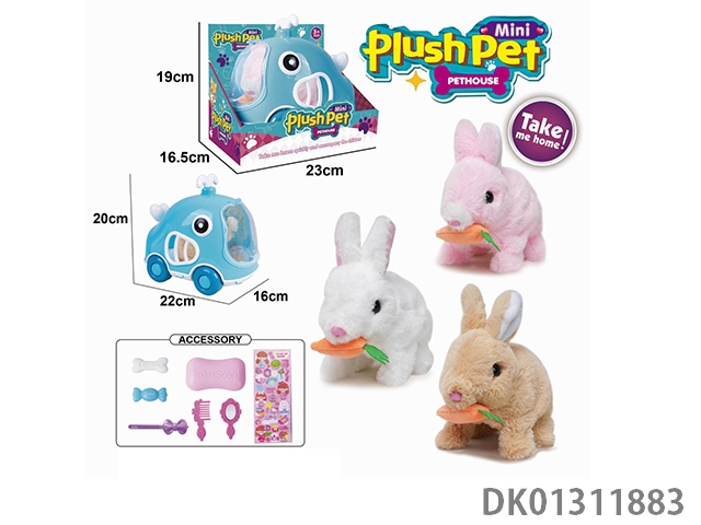 Electric plush walking rabbit and hand pulled animal cage and accessory set