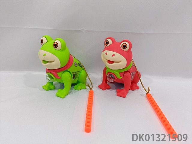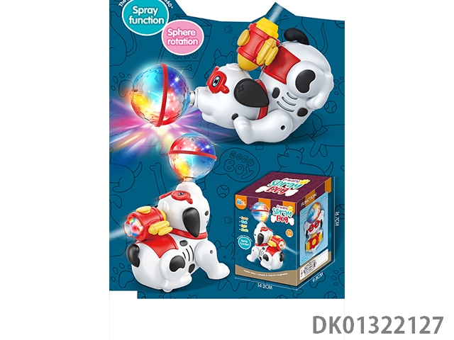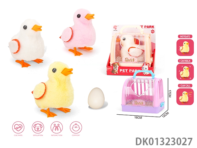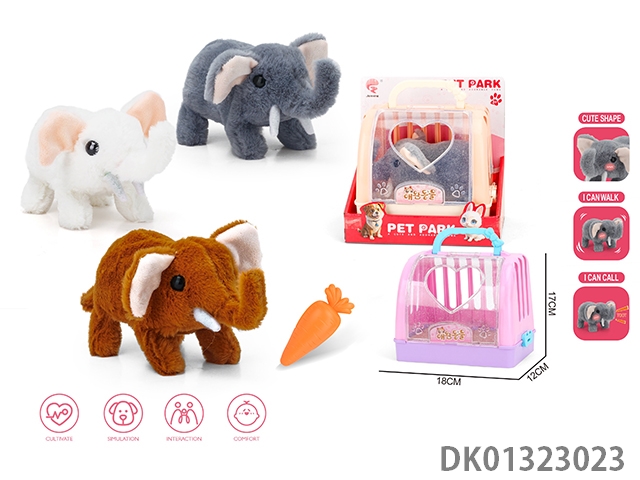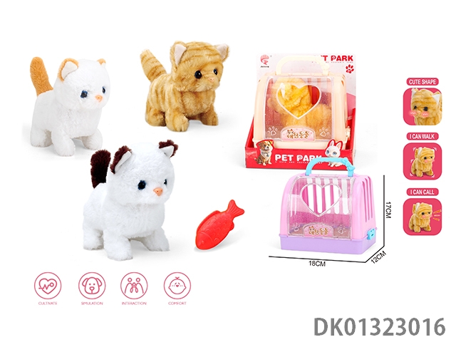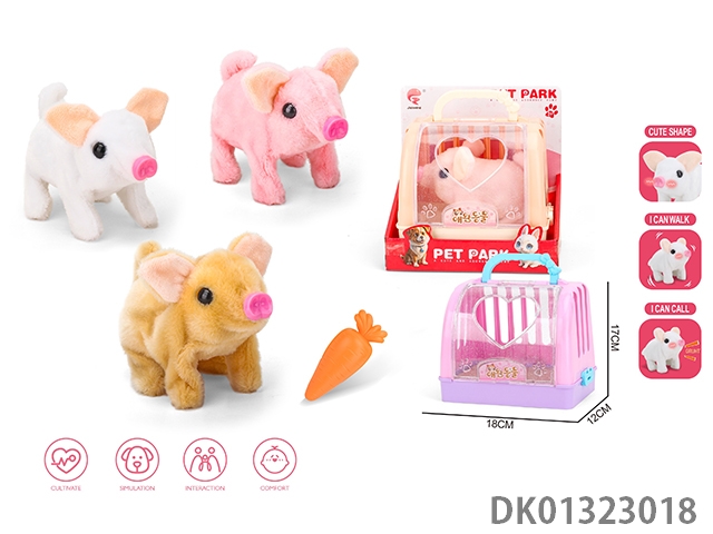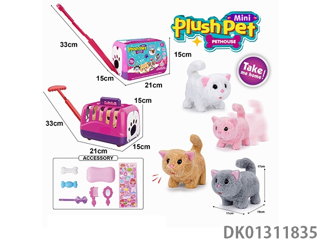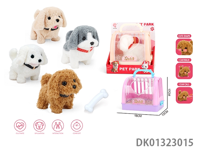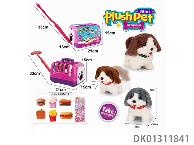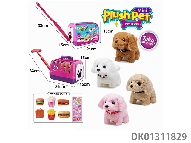 Electric colored plush walking dog and hand pulled animal cage and burger combo